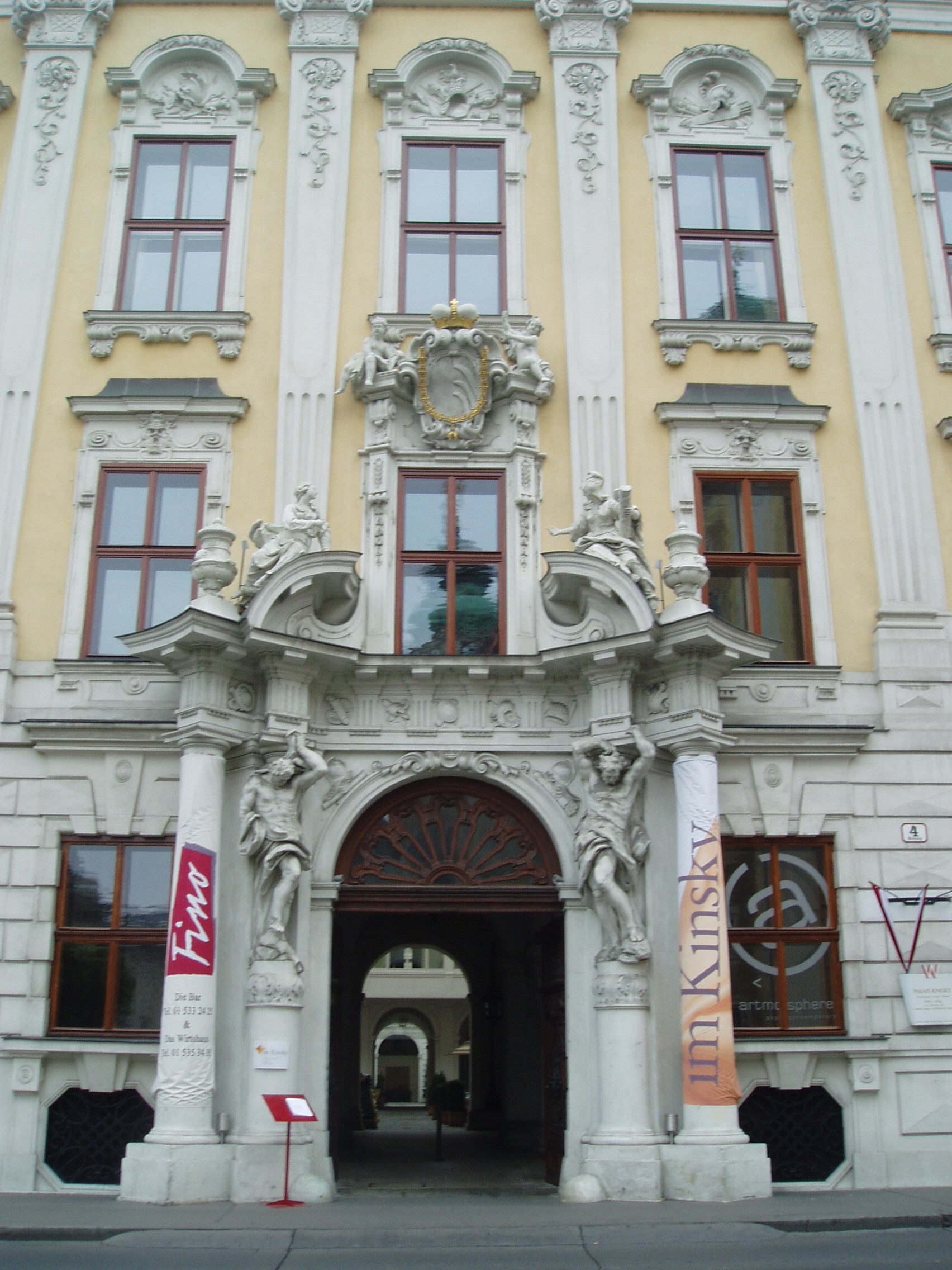 Nyilvános 1445 | 3439 | Freyung 4. Kinsky-palota | A Kinsky hercegi család városi palotáját 1713-16 között a bécsi barokk építészet Fischer von Erlach mellett másik legkiválóbb mestere, Johann Lucas von Hildebrandt építette át eredetileg annak a Daun grófnak a megbízásából, akinek a fia, Leopold Joseph Daum Mária Terézia egyik hadvezére lett Monumentális szobrok állnak a bejárat két oldalán és a bejárat felett; hasonló méretűek emelkednek magasba a harmadik emeletet szegélyező tetőpárkányon. Ha áthaladunk a bejárati kupolacsarnokon, két nagy belső udvar tárul fe előttünk. Az első udvart a palota barokk szárnyépületei állják körül. A hátsó udvart a palota még későbbi, már klasszicista stílusban emelt szárnyépületei szegélyezik. A lépcsőház a legszebbek egyike Bécsben. Az előcsarnok ovális boltozata fölött az első emeleten ovális alaprajzú a díszterem is, mennyezetén Carlo Carlone freskójával. Az első emeleti szalon mennyezetén négy kör alakú festményt helyeztek el, amelyek a művészetek szimbólumait jelenítik meg. Amikor Kinsky Ferdinand herceg volt e palota ura, Beethoven zenetanárként kezdett bejáratos lenni a házhoz; később a fényes estélyek vendégeit zongoravirtuózként és saját szerzeményei előadójaként is megnyerte művészetének. Midőn 1809-ben azzal a gondolattal foglalkozott, hogy elhagyja Bécset és Kasselbe megy, Kinsky herceg kezdeményezésére Rudolf főherceg és Lobkowitz herceg közösen életjáradékot biztosítottak a művésznek (ezen belül Kinsky adta a nagyobb összeget); a herceg feleségének, akiről Beethoven azt mondta, hogy „Bécs legcsinosabb és legkövérebb asszonya”, három, Goethe-versekre írt dalát ajánlotta a mester. |