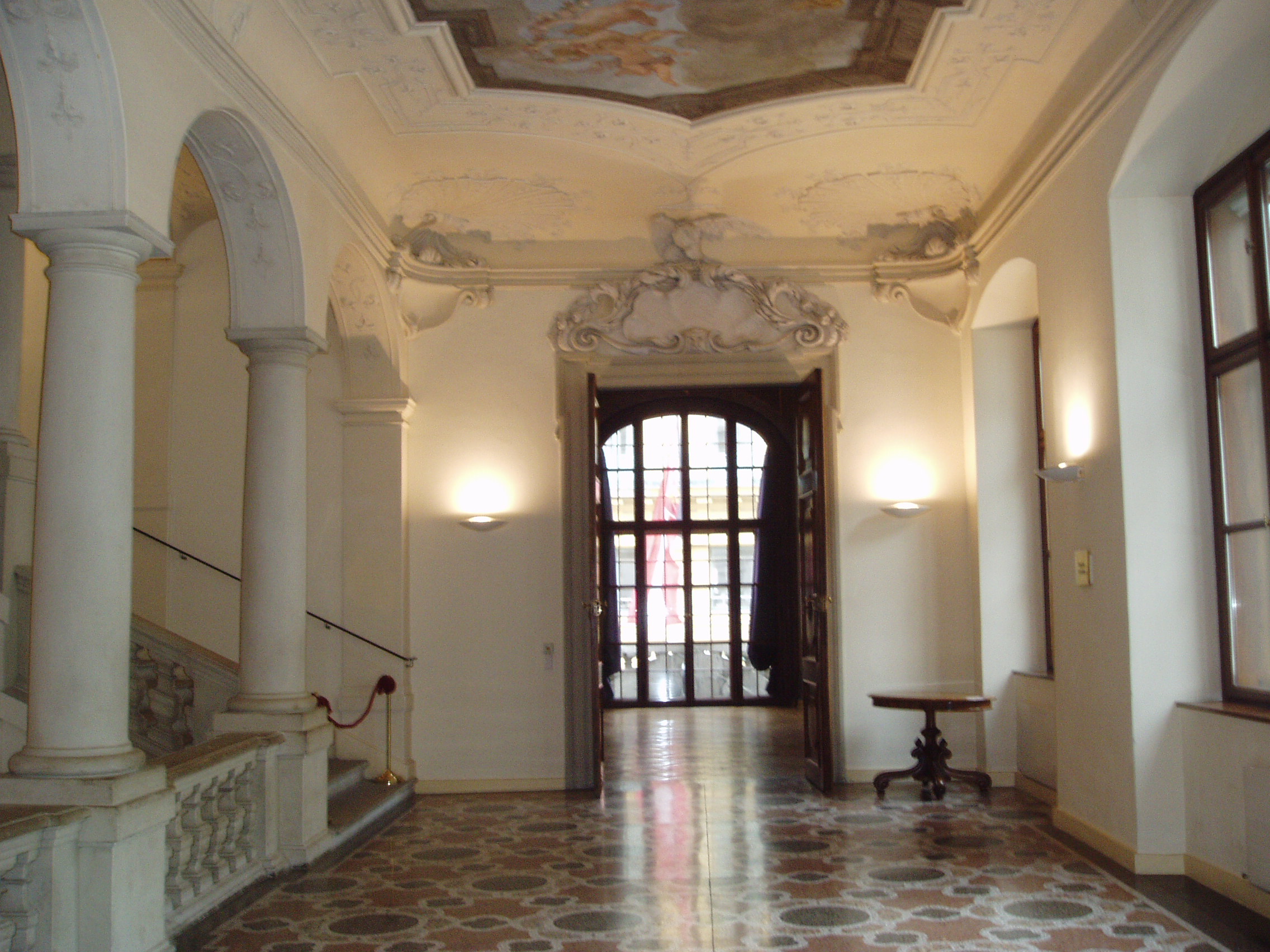 Nyilvános 1523 | 3559 | Rövid leírás | Teljes leírás (1.24 KB) | Augustinerstrasse 2. Lobkowicz-palota Eredetileg a Dietrichstein grófok számára épült 1685-87 között barokk stílusban, az olasz Giovanni Pietro Tencala építőmester tervei szerint. A Lobkowitz hercegek kívánságára a főhomlokzatot Johann Bernard Fischer von Erlach alakította át 1709-11 között. A palota dísztermét Eroica-teremnek is nevezik, mert 1805. január 3-án Beethoven itt mutatta be III. (Eroica) szimfóniáját. E palotához fűződik az az anekdota, hogy – ugyancsak 1805-ben – Fidelio című operája első változata körüli vitában Beethoven feldühödve hagyta ott a tiszteletére összegyűlt főúri társaságot, s még visszakiabált az utcáról: „Lobkowitz szamár!” Ám a kapcsolatnak ez a dühkitörés nem vetett véget, a zenekedvelő, saját szimfonikus zenekarral rendelkező herceg továbbra is Beethoven mecénása maradt. 1807-ben ugyanitt rendezték meg Beethoven IV. szimfóniájának az ősbemutatóját is. A képen az Eroica-terem bejárata előtti előcsarnok látható, a szemben levő ajtó vezet a terembe (a freskókkal ékesített zeneteremben nem lehet fényképezni). Ebben a palotában tekinthető meg az Osztrák Színháztörténeti Múzeum gyűjteménye is. |