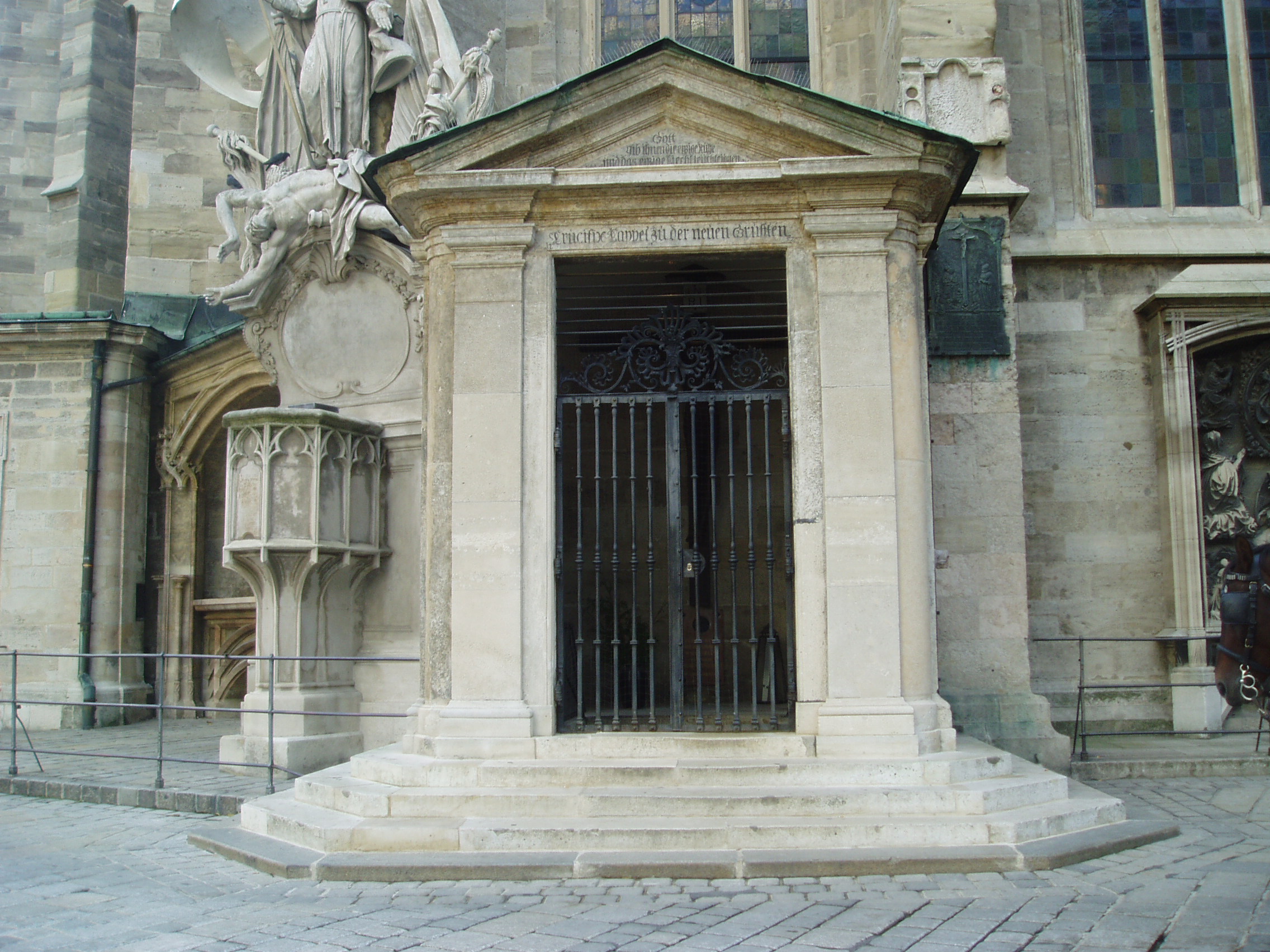 Nyilvános 1099 | 2443 | Ha kívülről megkerüljük a Stephansdom épületét, a hátsó oldalánál, ahol a fiákeresek gyülekeznek, egy kis oldalkápolnát találunk. Itt ravatalozták fel a beszentelés után Mozart holttestét és innét vitték ki a St.Marx-temetőbe, hogy aztán sírhelye örökre feledésbe merüljön. Ha benézünk a kápolna rácsain, Mozart emléktábláját olvashatjuk. | |