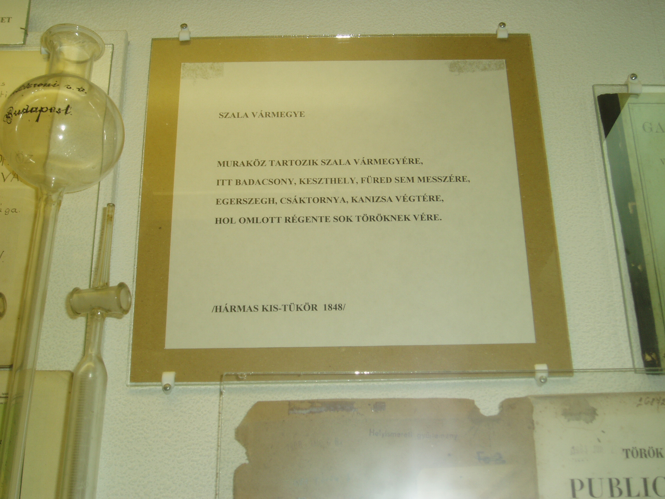 Nyilvános 1010 | 1694 | Tapolca: Templom domb 8. Múzeum | A múzeum épülete, az ún. Kántorház - a város védett építészeti emléke - Tapolca történelmi városközpontjában, a Malom-tó fölötti Templom dombon található. Ide járt elemi iskolába a város nagy szülötte, Batsányi János költő. Az épületben 1733-tól 1884-ig folyt az elemi iskolai oktatás. A múzeum iskolatörténeti kiállításán olvasható idézet, Zala vármegye verses összefoglalása a Hármas kis-tükör c. 1848-as tankönyvből. A felvétel 2007 februárjában készült. Felh. irod.: Látnivalók Veszprém megyében. Miskolc, Well-PRess, 2000 Hangodi László: Múltbanéző - kiállításvezető a Tapolcai Városi Múzeum tárlataihoz. Tapolca, 2006 |