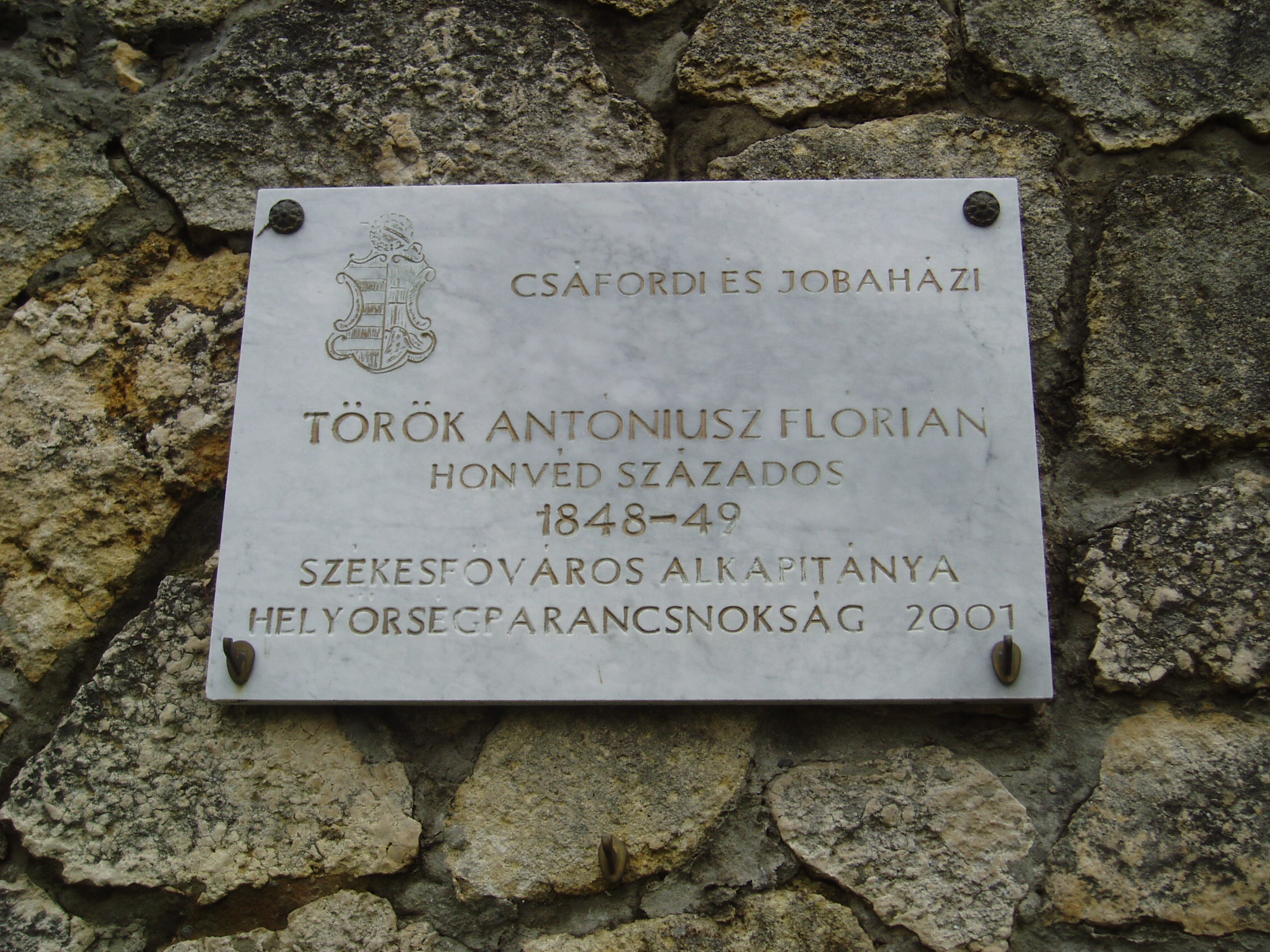 Nyilvános 981 | 1669 | Tapolca, Városi Panteonfal: Török Antóniusz Flórián emléktáblája | A Malom–tó mögött álló magas kőfal a Városi Panteonfal, amelyen több neves, tapolcai kötődésű személyiségnek állítottak emléktáblát. Török Antóniusz Flórián (1825-1878) 1848/49-ben honvéd százados volt. 2001-ben felavatott emléktáblája a testvére, Török János emlékét őrző tábla mellett látható. A felvétel 2007 februárjában készült. Felh. irod.: Bándi László: Emlékhelyek Veszprém megyében. Veszprém, 1996 www.tapolca.hu |