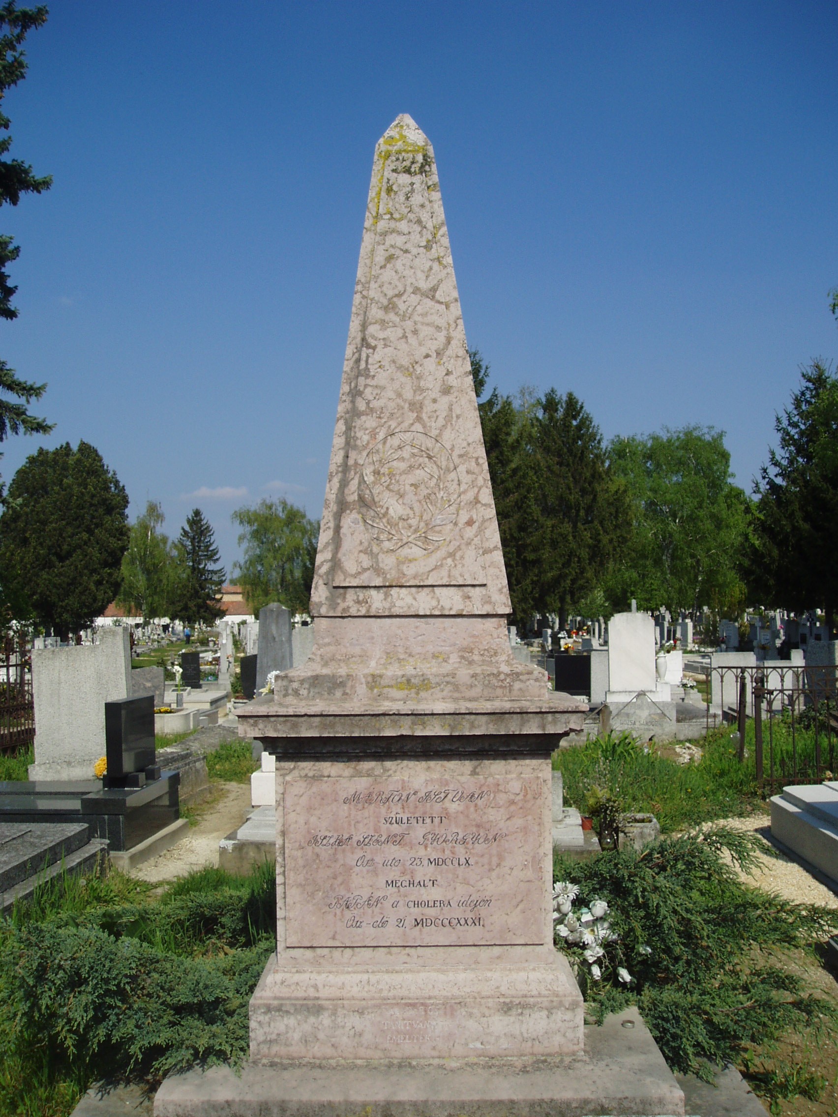 Nyilvános 1232 | 3753 | Pápa, Alsóvárosi temető: Mándi Márton István sírja | A Jókai utcáról nyíló Temető utca vezet a XIX. század elején megnyílt Alsóvárosi köztemetőbe. A város sok neves személyiségének van itt a sírja. Itt nyugszik Mándi Márton (Iszkaszentgyörgy, 1760. nov. 23. – Pápa, 1831. szept. 21.) nyelvész, tanár, filozófus. Kecskeméten, Debrecenben, majd Göttingában tanult. 1790-től volt a pápai református gimnázium rektor-professzora. Nevéhez fűződik az iskola új fellendülése. A filozófiában Kant követője volt és 1795-ben már Kant tanítása alapján tartott előadásokat, amelyekért súlyos bírálat érte. Márvány mellszobra, Izsó Miklós alkotása a református könyvtárban látható (Pápa, Március 15. tér 9.). A városban utcanév, az Ókollégium (Petőfi S. utca 13.) falán tábla őrzi emlékét. A fénykép 2007 áprilisában készült. Felh. irod.: Németh Adél - Szabó Lajos: Pápa. Bp. Panoráma, 1989 Veszprém megyei életrajzi lexikon. Veszprém, Veszprém Megyei Önkormányzat Közgyűlése, 1998 |