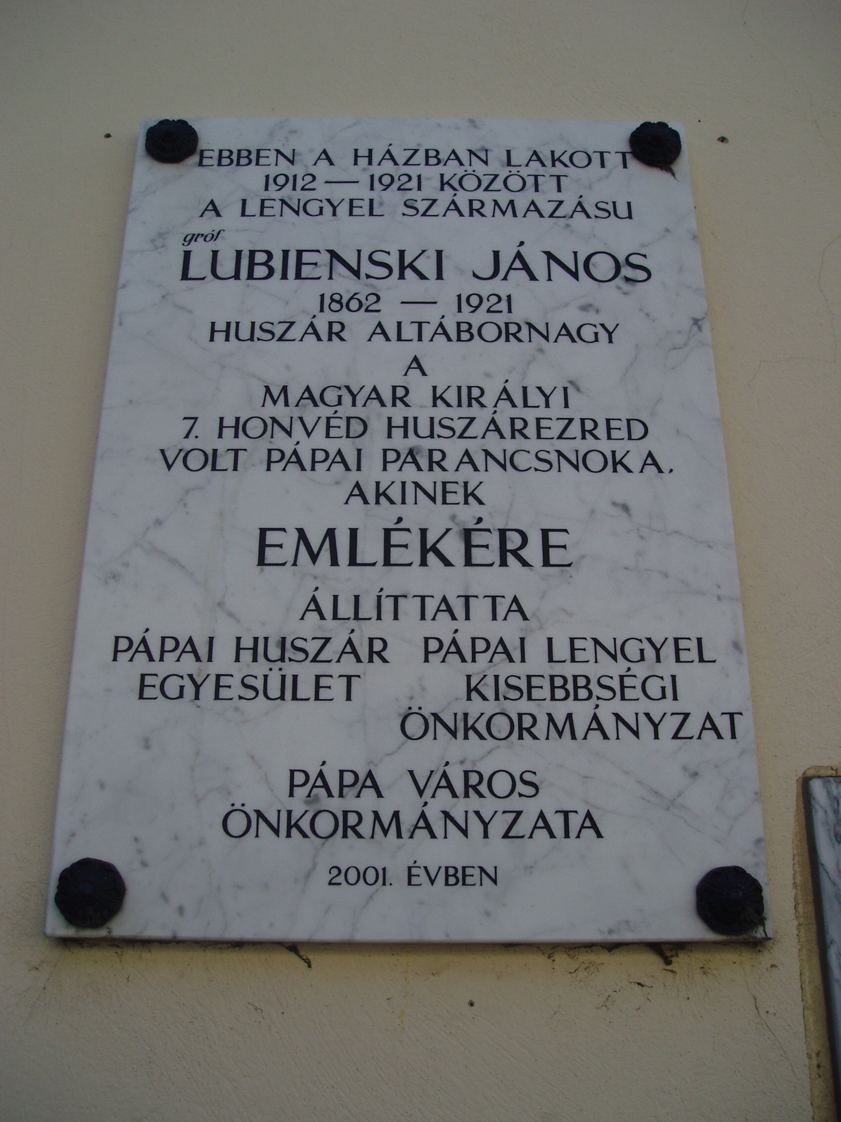 Nyilvános 997 | 1828 | Pápa, Fő tér 21. Zichy-ház | A saroképület Korvin utca felőli oldalon 2001-ben helyezték el gróf Lubienski János (1862-1921) lengyel származású huszár altábornagy emléktábláját, aki a 7. Honvéd Huszárezred pápai parancsnoka volt, s 1912-1921 között ebben a házban lakott. Életéről és tevékenységéről Fejes Sándor írt monográfiát (Gróf Lubienski János huszár altábornagy 1862-1921. Pápa, Pápai Lengyel Kisebbségi Önkormányzat, 2002). A fénykép 2007 áprilisában készült. |