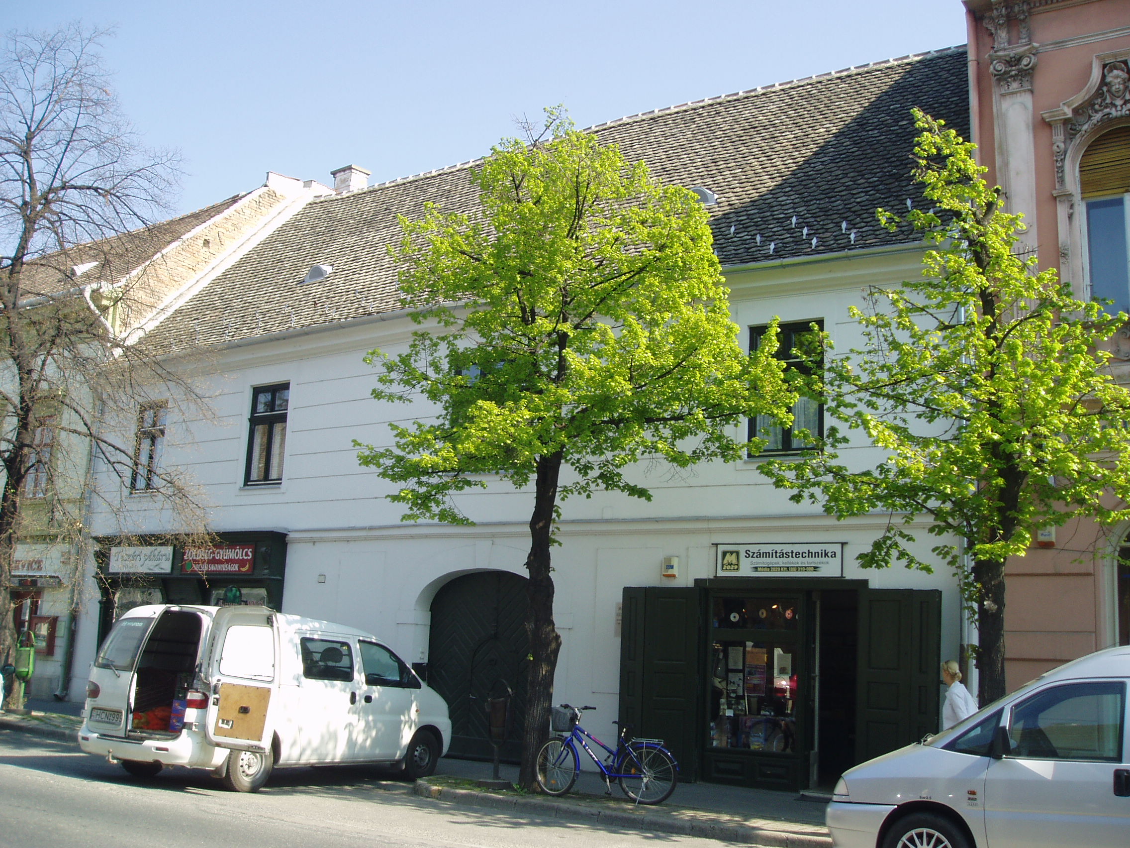 Nyilvános 1000 | 1666 | Pápa, Fő utca 6. Református lelkészlak | A református lelkészlak egyszerű, egyemeletes épület,. 1750 körül emelték barokk stílusban; sajnos, az átépítések következtében nagyrészt elvesztette eredeti arculatát. Udvarán - és a Fő utca 4. számú ház udvarán - áll a Református Ótemplom, azon a helyen, ahol 1718-1752 között egy fészer szolgált az istentisztelet helyszínéül. Az ótemplom felépítését II. József türelmi rendelete tette lehetővé 1783-ban. A rendeletben előírtak betartásával a templom nem az utca homlokzatvonalában, hanem zárt udvaron és torony nélkül épülhetett csak fel. A templom a késő barokk - kora klasszicista stílusú református templomok legkorábbi képviselője. 1972-ben nyitották meg benne a Református Egyháztörténeti Múzeum kiállítását. Sajnos jelenleg (2007. április) sem az épület, sem a kiállítás nem látogatható "takarékossági okok" miatt (fényképet sem tudtam róla készíteni, csak az utcafrontról: K. K.). A fénykép 2007 áprilisában készült. Felh. irod.: Németh Adél - Szabó Lajos: Pápa. Bp. Panoráma, 1989 |