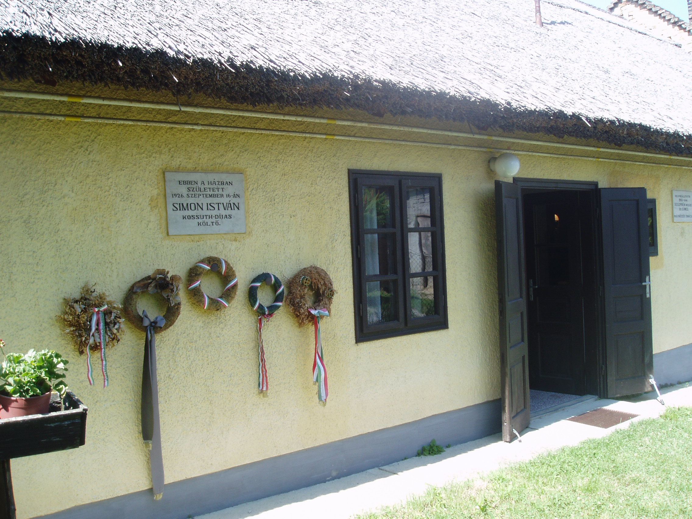 Nyilvános 1211 | 2865 | Bazsi, Fő út 149. | 1926. szeptember 16-án itt, az udvari házrészben született Simon István költő. A kis épületet 1983. április 11-én, a költészet napján, országos ünnepség keretében avatták emlékházzá. Benne ma is a költő szüleinek eredeti bútorai és tárgyai láthatók, Simon Istvánról szóló dokumentációval kiegészítve. Simon István tizennyolc éves koráig élt Bazsiban. A sümegi gimnáziumot bejáró diákként végezte el. 1948-tól Budapesten lakott, de gyakran hazajárt szülőfalujába. Számos, ebben a házban készült fényképen látható idős szüleivel a már nagy elismertséget elért költő. 1975 nyarán nagybetegen került a sümegi kórházba, ahol július 6-án elhunyt. Kívánságának megfelelően Bazsiban temették el (sírjánál sajnos nem jártam, a temető elég messze van a falutól - K.K.). A szegényparaszti környezet, a szülőföld, a Sümeg környéki táj mindvégig éltető eleme volt költészetének. A fénykép 2007 júniusában készült. Felh. irod.: Erős Zoltán: Magyar irodalmi helynevek A-tól Z-ig. Bp. Kis-Lant Kiadó, 1995 |