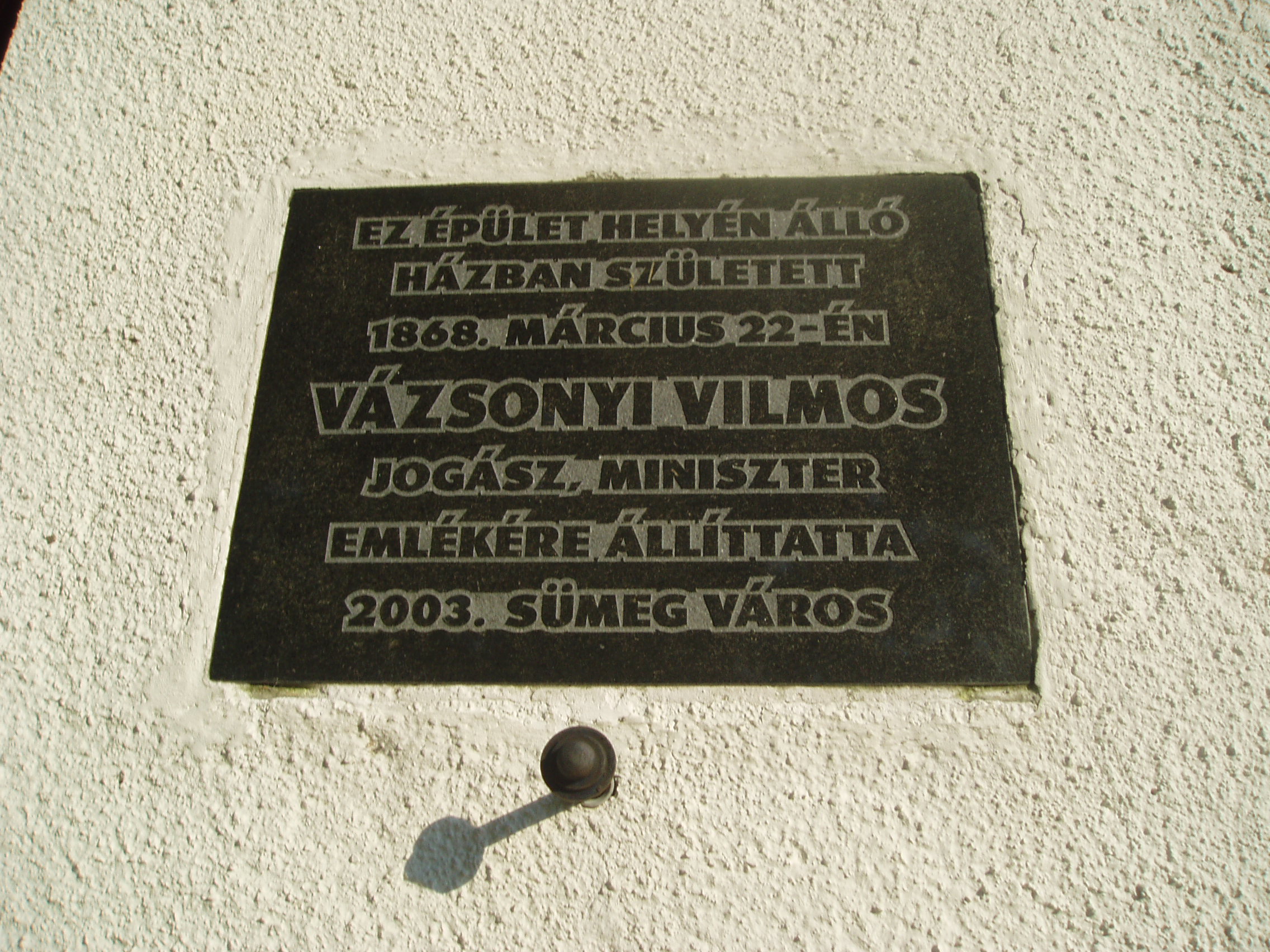 Nyilvános 966 | 1553 | Sümeg, Flórián tér - Árpád utca sarok | A modern áruház Árpád utca felőli oldalán Vázsonyi Vilmos jogász, miniszter, politikus emléktáblája olvasható, aki a korábban ezen a helyen állott házban született 1868. március 22-én. jogász, miniszter, politikus. A budapesti egyetemen jogot végzett, majd ügyvédként dolgozott. 1894-ben megalapította a Demokratikus Kört és még ugyanabban az évben bekerült Budapest törvényhatóságába. 1901-ben demokrata párti programmal országgyűlési képviselő. 1904-ben a vasutassztrájk idején a sztrájkolók és a kormány közötti tárgyalásokat vezette, majd a perbe fogott vasutasok védelmét látta el. 1917–1918-ban igazságügy-miniszter két kormányban is. Fellépett a háborúellenes és a forradalmi mozgalmak ellen. Az őszirózsás forradalom napján emigrált és csak az ellenforradalom hatalomra jutása után tért haza. Az újjászervezett Nemzeti Demokrata Polgári Párttal a legitimistákat támogatta. 1924-ben már a baloldali ellenzék egy részét összefogó Demokrata Blokk létrehozásában és tevékenységében is közreműködött. A frankhamisítási ügy parlamenti tárgyalásán a kisebbségi vélemény egyik szerkesztője, emiatt soviniszta körök részéről súlyos támadások érték. Külföldre utazott gyógykezeltetés céljából és a frankhamisítás bírósági tárgyalása idején hirtelen meghalt Badenben 1926. május 29-én. Bátyja, a Csabrendeken született Vázsonyi Jenő gépészmérnök, aki 1918-tól államtitkári címmel az államvasutak elnökigazgatója volt. Vezetése idején kezdődött meg hazánkban a vasútvonalak villamosítása. Szerepe volt Budapest utcai világításának korszerűsítésében és a hazai tőzegtermelés megindításában. Verus álnéven verseket is írt, amelyek Száz epigramma címmel jelentek meg. A fénykép 2007 júniusában készült. Felh. irod.: Veszprém megyei életrajzi lexikon. Veszprém, Veszprém Megyei Önkormányzat Közgyűlése, 1998 |