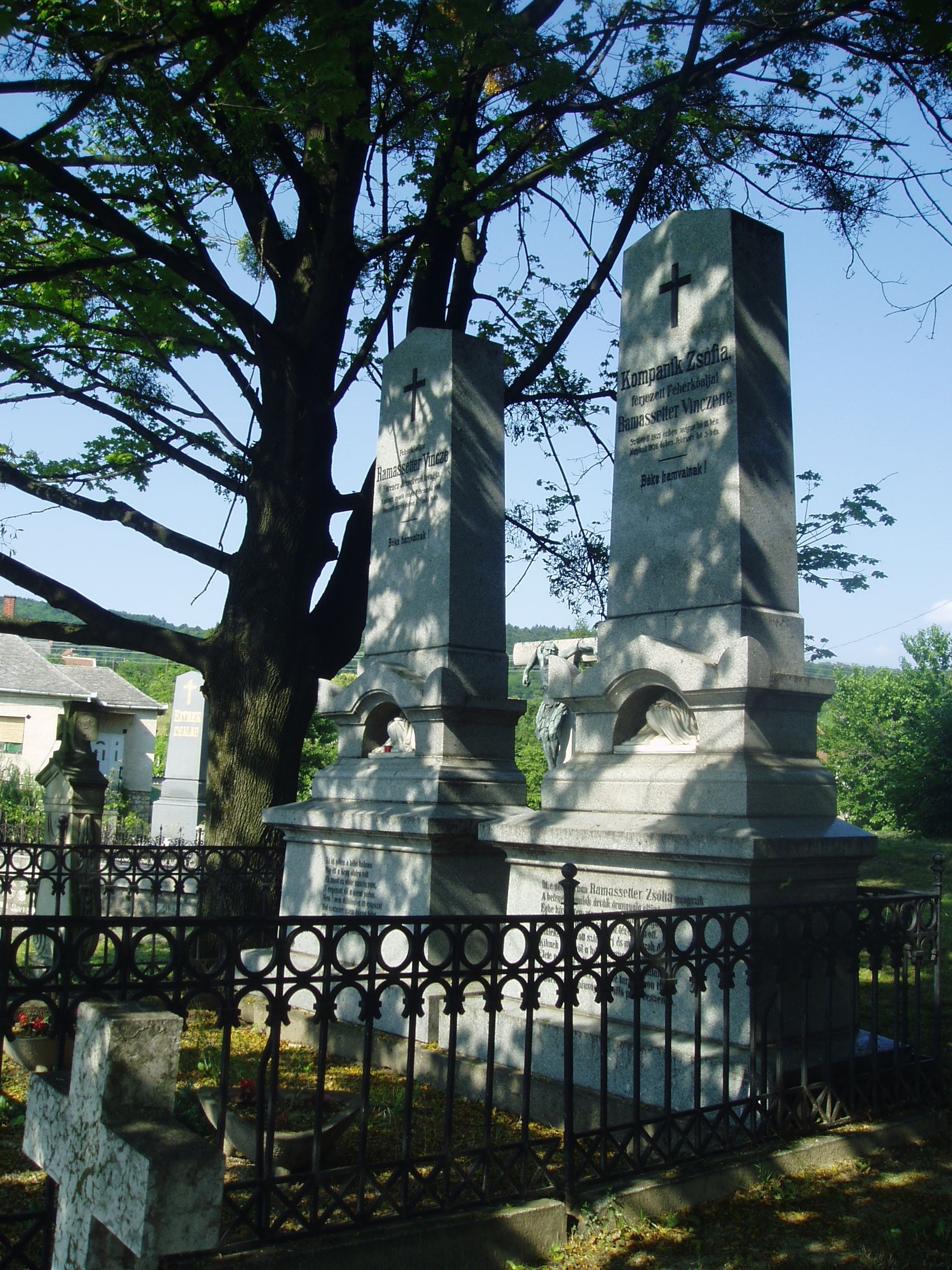 Nyilvános 991 | 2075 | Sümeg, Temető. Ramassetter Vince sírja | Sümeg délkeleti határában, a Tapolcára vezető út mellett emelkedő lankás domboldalon találjuk a város köztemetőjét. Helyét még Bíró Márton püspök jelölte ki; jelentősebb számban a XIX. század eleje óta kezdtek ide temetkezni. A temetődomb tetején áll az 1816-ban épített, későbarokk stílusú temetőkápolna. Körülötte a sümegi élet utolsó két évszázada szinte valamennyi híres személyiségének sírja fellelhető. Közvetlenül a kápolna előtt magasodik Ramassetter Vince (1806-1878) és felesége, Kompanik Zsófia (1821-1876) kettős, szürke gránitból kifaragott obeliszkje. A Sümeg atyjának is nevezett Ramassetter Vince nevéhez többek között iskolák, óvoda és kórház alapítása fűződik. Nevét és emlékét egészalakos szobor (lásd: Kossuth u. 13.) és több emléktábla is megörökíti a városban (lásd: Árpád u. 5., Deák F. u. 8., Mártirok u. 1., Panteonfal, Rammassetter u. 10.). A fénykép 2007 júniusában készült. Felh. irod.: Koppány Tibor - Kozák Károly: Sümeg útikalauz. Veszprém, Idegenforgalmi Hivatal, 1965 Sümegi kalauz. Sümeg, Sümegi Fórum Alapítvány, 1993 Miklósi-Sikes Csaba: Kőbe vésett történelem. A sümegi városi temetők története és sírjelei 1950-ig. Sümeg, Sümegi Fórum Alapítvány, 2002 Veszprém megyei életrajzi lexikon. Veszprém, Veszprém Megyei Önkormányzat Közgyűlése, 1998 |
