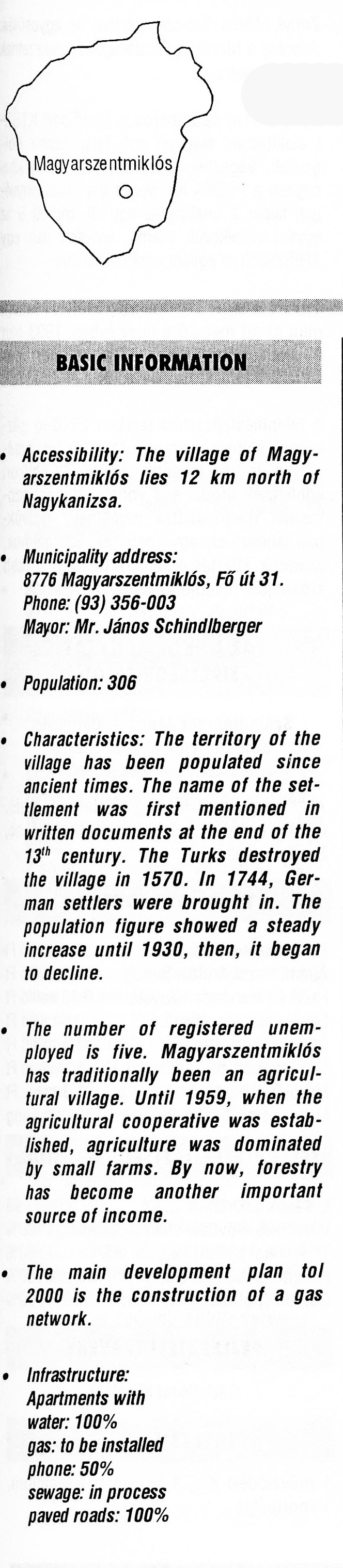 Nyilvános 2356 | 6260 | Magyarszentmiklós | BASIC INFORMATION Accessibility: The village of Magyarszentmiklós lies 12 km north of Nagykanizsa. Municipality address: 8776 Magyarszentmiklós, Fő út 31. Phone: (93) 356-003 Mayor: Mr. János Schindlberger Population: 306 Characteristics: The territory of the village has been populated since ancient times. The name of the settlement was first mentioned in written documents at the end of the 13th century. The Turks destroyed the village in 1570. In 1744, German settlers were brought in. The population figure showed a steady increase until 1930, then, it began to decline. The number of registered unemployed is five. Magyarszentmiklós has traditionally been an agricultural village. Until 1959, when the agricultural cooperative was established, agriculture was dominated by small farms. By now, forestry has become another important source of income. The main development plan tol 2000 is the construction of a gas network. Infrastructure: Apartments with water: 100% gas: to be installed phone: 50% sewage: in process paved roads: 100% This text came from the following book: Title: Handbook of Zala county (Zala megye kézikönyve) Series: County handbooks of Hungary (Magyarország megyei kézikönyvei) Chief editor: Hóbor József Publisher: (Hatvan), CEBA-Hungary Ltd, 1998 ETO: 908.439.121(035) ; 050.8(439.121) ISBN: 963-9089-18-2 Pages: 488-1040 p. Remark: Closed on: 1998. márc. 31. |