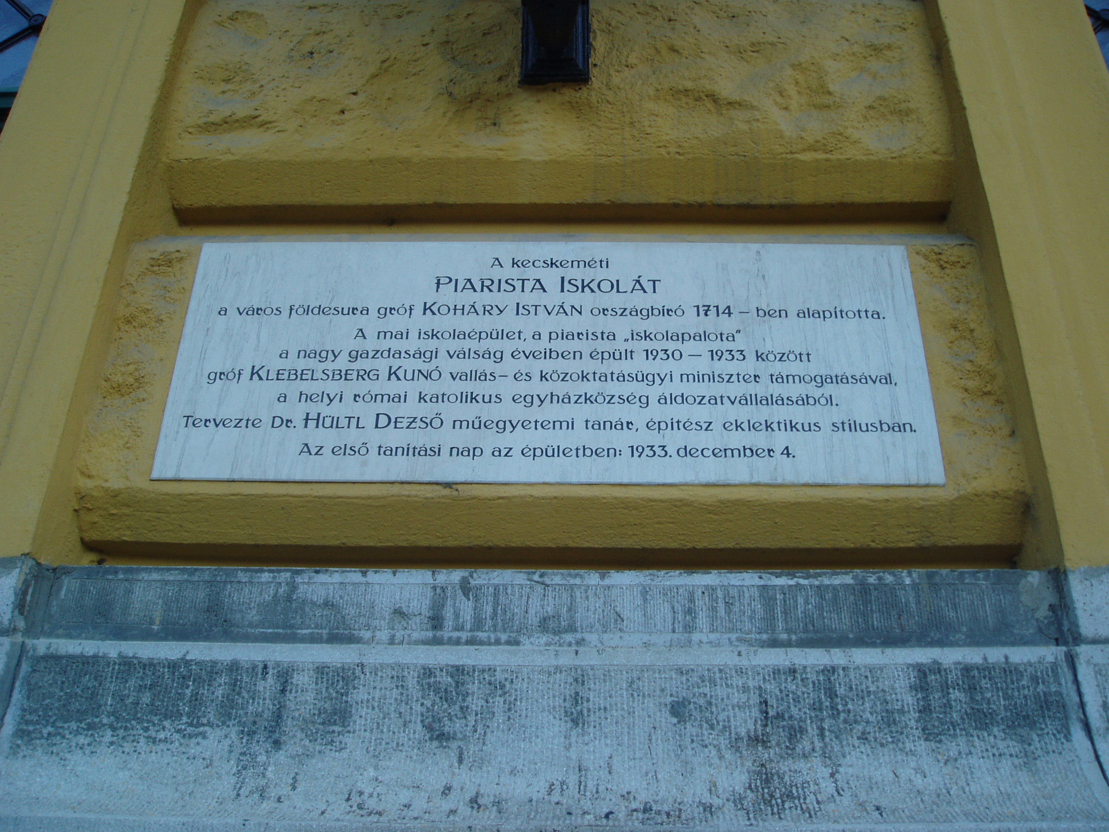 Nyilvános 1011 | 1722 | Kecskemét, Piaristák tere 5. | A mai Piarista Gimnázium és Általános Iskola a nagy múltú régi iskola (lásd: Kecskemét, Jókai u. 1.) közelében 1930 körül épült Hütl Dezső tervei alapján a hajdani főreáliskola helyére. A klasszicizáló huszártoronnyal díszített kétemeletes, monumentális iskolaépület homlokzati frontján Bory Jenő allegorikus szobrai láthatók. Mindkettőnek Kalazanci Szent József a főalakja. A fénykép 2006 augusztusában készült. Felh. irod.: Heltai Nándor: Kecskemét. Kecskeméti Lapok, 1998 |