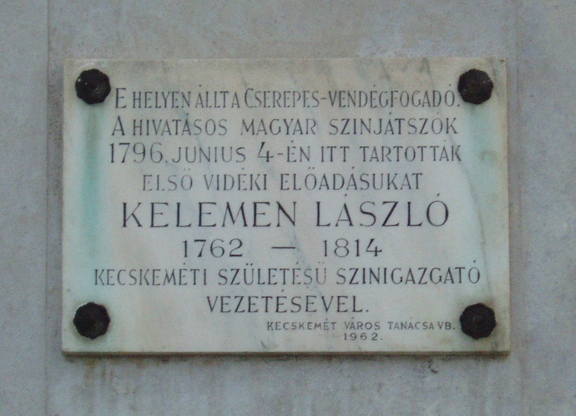 Nyilvános 1067 | 1906 | Kecskemét, Piaristák tere 7. | Az 1950-ben épült kocka alakú, háromszintes SZTK rendelőintézet helyén az 1773–1776 között épített Arany Sas vendégfogadó állott, amelyet a kecskemétiek csak Cserepes néven emlegettek. Udvari fészerében a XVIII. század legvégén alkalmi színpadot alakítottak ki, itt szerepeltek először a városban hivatásos magyar színjátszók, az Első Magyar Játékszíni Társaság. Vezetőjük a kecskeméti születésű Kelemen László volt. Kelemen Lászlóék első kecskeméti előadását Liszka Béla helybeli főreáliskolai tanár keltezte 1796-ra. Újabb vélemények szerint azonban az első hivatásos magyar nyelvű színtársulat csak 1800 nyarán lépett fel Kecskeméten. 1800-ban még Kelemen társulatának tagja volt a szintén kecskeméti születésű és az 1780-as években a piarista gimnáziumban (lásd: Kecskemét, Jókai u. 1.) diákoskodott Szerelemhegyi András, aki színészként és/vagy zenei mindenesként valószínűleg közreműködött a „Cserepes” udvarán megtartott előadásokon. Az Arany Sas fogadóban kecskeméti tanulmányainak megkezdésekor megszállt Jókai Mór, 1857-es országjárása idején pedig Ferenc József és felesége, Erzsébet királyné. Később az épület járásbíróság, majd kórház lett. 1948-ban lebontották s két év múlva emelték helyére a ma is álló épületet. A rendelőintézet Piaristák terére néző falán 1962-ben emléktáblát helyeztek el. A fénykép 2006 augusztusában készült. Felh. irod.: Heltai Nándor: Kecskemét. Kecskeméti Lapok, 1998 Bács-Kiskun megyei történeti és kegyeleti emlékhelyek számbavétele. Kecskemét, 1989. Birck Edit: A Duna–Tisza köze irodalmi országútjain. = Honismeret 2001. 3. |