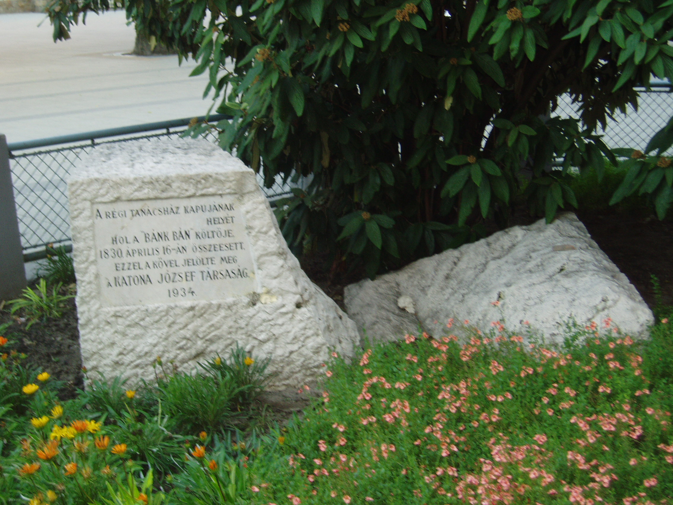 Nyilvános 1014 | 1671 | Kecskemét, Kossuth tér 1. | A szecessziós stílusú városháza 1892-1896 között épült Lechner Ödön és Pártos Gyula tervei szerint. Helyén egykor a régi városháza állott, ott dolgozott Katona József, mint városi ügyész, majd főügyész. Egy zsúfolt délelőtt után, miután megebédelt, egy kollégájával beszélgetve visszafelé tartott hivatalába, amikor a belső folyosón összeesett és szívszélhűdésben elhunyt. Halálának helyén, amely a mai épület előtt található, emlékkövet helyeztek el 1934-ben a következő szöveggel: "Itt hasadt meg a szíve Kecskemét legnagyobb fiának". A fénykép 2006 augusztusában készült. Felh. irod.: Heltai Nándor: Kecskemét. Kecskeméti Lapok, 1998 |