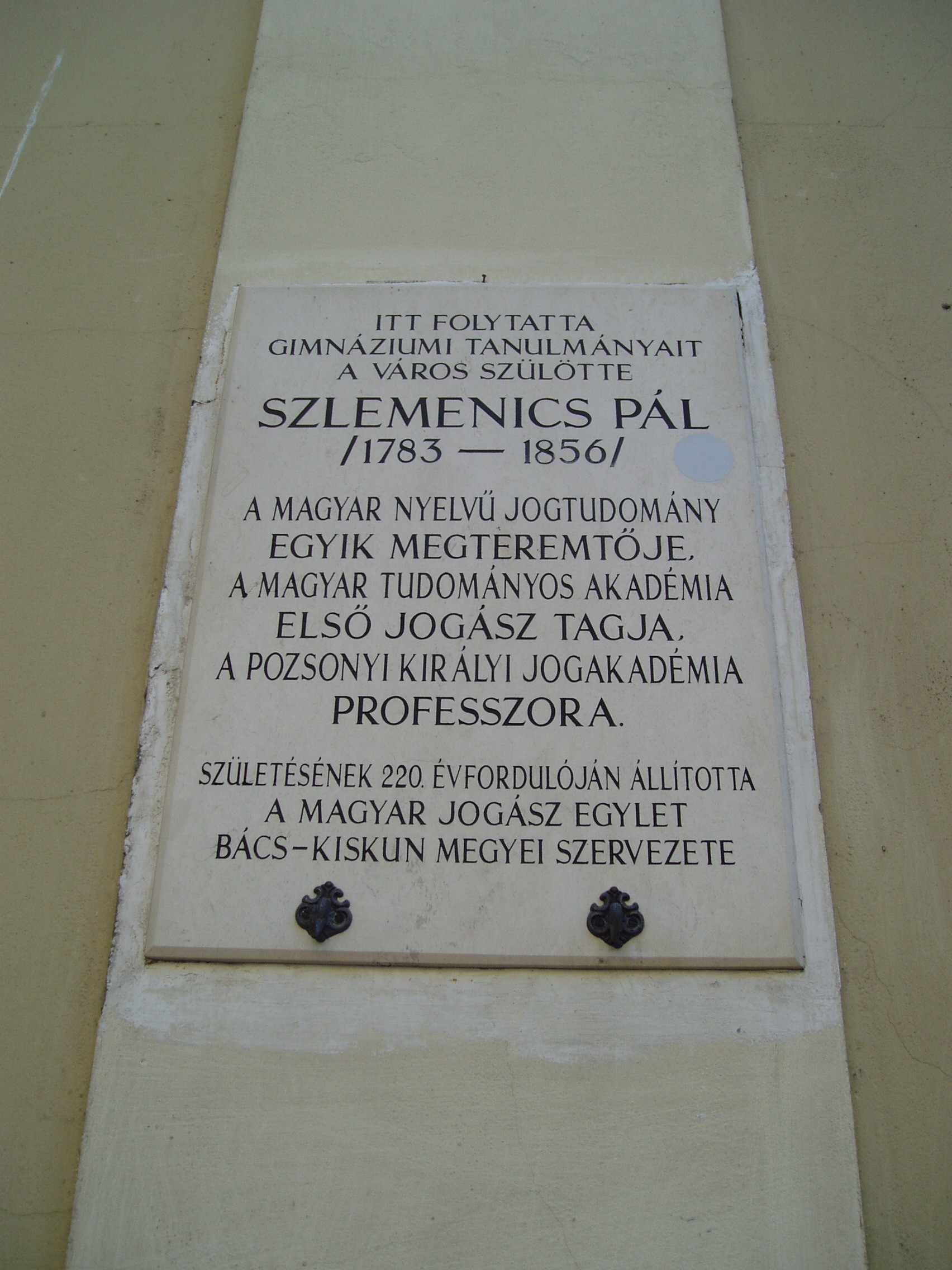 Nyilvános 1039 | 1641 | Kecskemét, Jókai utca 1. Piarista rendház és kollégium | A műemléki védelemmel óvott piarista rendház a mellette álló templommal együtt a város legszebb barokk épületegyüttese. A piarista atyákat a város egyik földesura, gróf Koháry István telepítette le Kecskeméten a XVIII. század elején, s 1712-ben alapítványt is tett templomuk, rendházuk és iskolájuk felépítésére. Az épületegyüttes fokozatosan, több ütemben készült el. A templomot nagy valószínűséggel Mayerhoffer András tervezte. Az oktatást a templom bal oldalán álló, 1720 és 1725 között, Paithmüller József tervei alapján emelt rendház helyiségeiben kezdték el. A jobb oldali iskolai szárnyat 1825–1832 között emelték, majd folyamatosan bővítették az épületet. Tanítás 1933-ig folyt benne. Ide járt iskolába 1804 és 1807 között Katona József, 1813-1815 között Táncsics Mihály, 1833-34-ben Klapka György, később Sík Sándor. Itt tanult az 1780-as években Szerelemhegyi Liebenberger András, a magyar zenés játék megteremtője, karnagy, valamint testvére, Lunkányi (Liebenber) János, Széchenyi István nevelője, műveinek első bírálója. A képen Szlemenics Pál (1783-1856) emléktáblája látható. A magyar nyelvű jogtudomány egyik megteremtője, a Magyar Tudományos Akadémia első jogász tagja, a pozsonyi Királyi Jogakadémia kecskeméti születésű professzora is ide járt gimnáziumba. A fénykép 2006 augusztusában készült. Felh. irod.: Heltai Nándor: Kecskemét. Kecskeméti Lapok, 1998 |