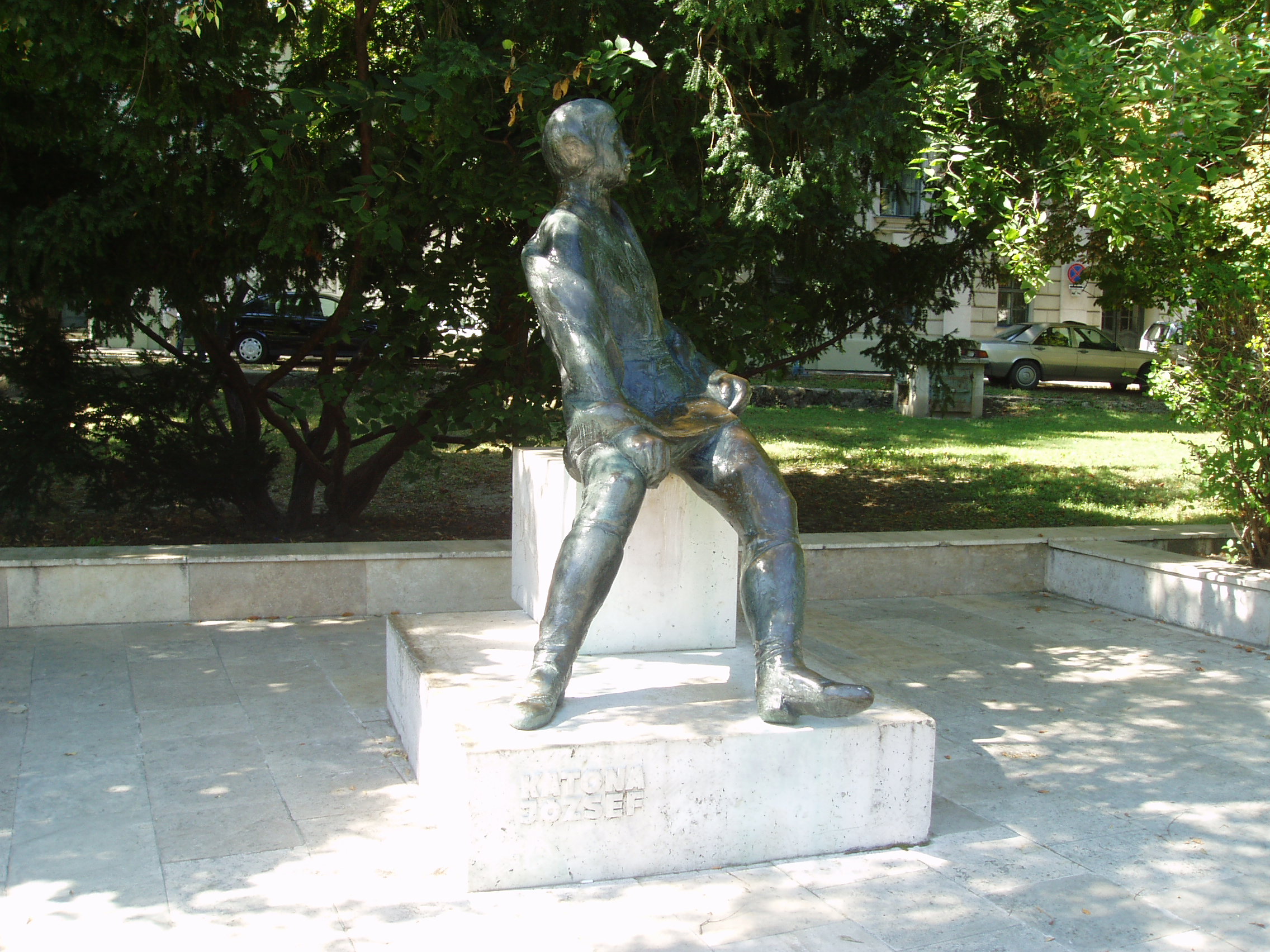 Nyilvános 966 | 1587 | Kecskemét, Katona József tér 05. Katona József emlékműve | A Katona József Színház mögött 1962. december 16-án Kodály Zoltán avatta fel Vigh Tamás szobrászművész alkotását, Illyés Gyula jelenlétében. Ezen a napon ünnepelte meg szülővárosa Kodály 80. születésnapját, s este a színházban rendezett díszhangversenyen Illyés Gyula maga olvasta fel a Bevezetés egy Kodály-hangversenyhez című versét. A fénykép 2006 augusztusában készült. Felh. irod.: Heltai Nándor: Kecskemét. Kecskeméti Lapok, 1998 Bács-Kiskun megyei történeti és kegyeleti emlékhelyek számbavétele. Kecskemét, 1989 |