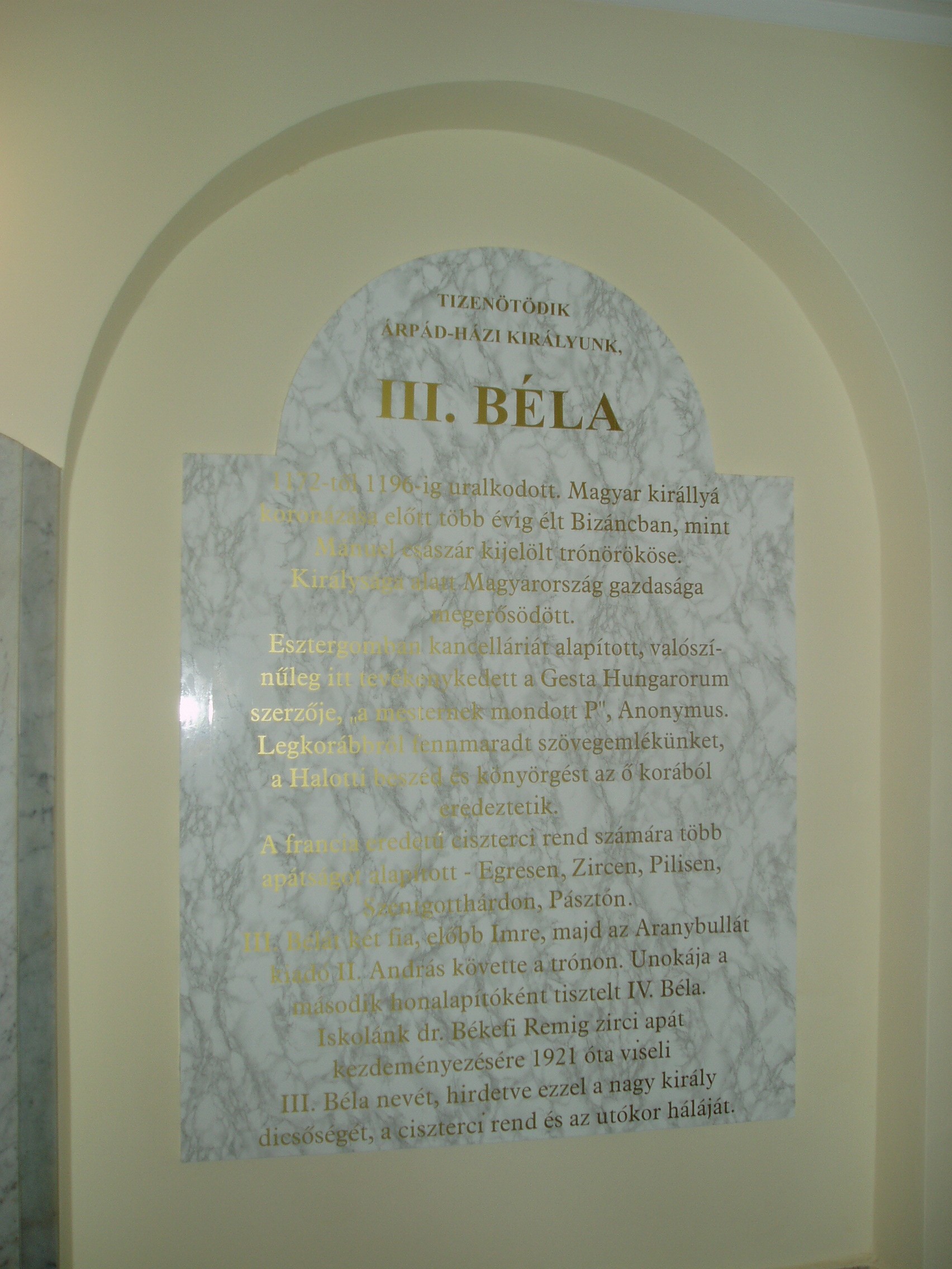 Nyilvános 957 | 1417 | Baja, Szent Imre tér 5. III. Béla Gimnázium: III. Béla emléktáblája az iskola előcsarnokában | Az 1757-ben alapított iskola mai épületét 1815-ben emelték, majd 1892-ben és 1931-ben jelentősen bővítették, alakították. Korábban a közelben ma is álló ferences kolostorban (lásd: Baja, Bartók B. u. 1-3.) folyt a tanítás. Az intézmény a ferencesek után 1879-től a ciszterci rendé lett. III. Béla nevét, aki a ciszter rendet letelepítette Magyarországon, az 1921/22-es tanévben vette fel. Ma már szobra is ott áll az épület előtt. 1948 óta állami iskola. Híres növendéke volt Nagy Ignác író (1819–1821), Türr István (1835–1840), Tóth Kálmán költő (1839–1845), Szarvas Gábor nyelvész (1842–1848). Pályakezdőként az 1905/06-os tanévben itt tanított Babits Mihály. Az iskolának a zenei életben nevet szerzett diákjai is voltak. Ide járt gimnáziumba az 1902/03-as tanévtől nyolc éven át a bajai születésű Kun Imre (1892–1977), a legendás hangversenyrendező és az 1940-es évek elején a szintén Baján született Lukin László (1926–2004) zenepedagógus, karnagy. A fénykép 2007 októberében készült. Felh. irod.: Bálint László: A bajai III. Béla Gimnázium. Bp. Tankönyvkiadó, 1989 |