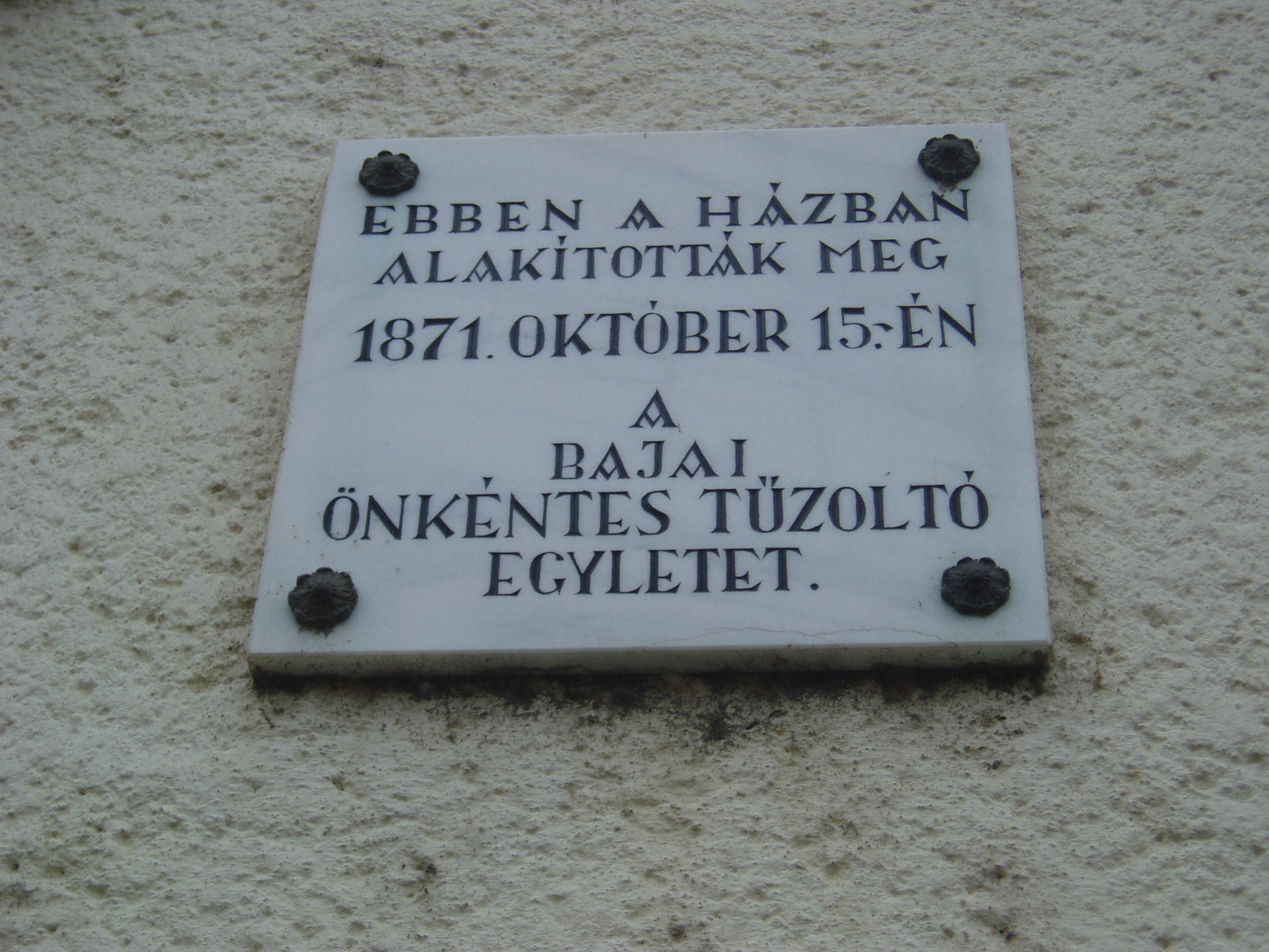 Nyilvános 992 | 1473 | Baja, Táncsics utca 12. | Mint az épületen elhelyezett emléktáblán is olvasható, ebben a házban alakult meg 1871. október 25-én a bajai Önkéntes Tűzoltó Egylet. Történelme során több nagy tűzvész is pusztított Baján. Az első jelentős, forásokkal is alátámasztott tűz 1742-ben emésztette fel a város nagy részét. Az ezt követő másfél évszázadban több, mint ezerszer lobbant fel a tűz a településen. Nagy tűz volt 1806-ban és 1819-ben, 1840-ben pedig az egész város leégett. A fénykép 2007 októberében készült. Felh. irod.: Gál Zoltán: A bajai tűzoltóság hőskora. = www.bacskaisport.hu |