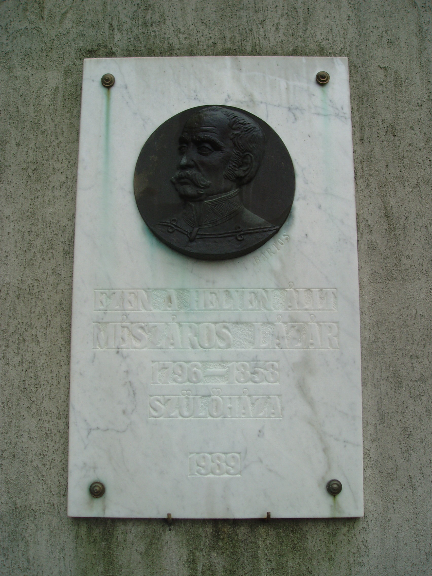 Nyilvános 1006 | 1461 | Baja, Vörösmarty utca 6. | A modern lakóház helyén állt egykor Mészáros Lázár, az első magyar hadügyminiszter szülőháza (Kemény Simon 1931-es könyve szerint az épület 1902. nagyszombat délutánján összeomlott). Márvány emléktábláját 1989-ben helyezték el. Mészáros Lázár 1796. február 20-án született Baján. Kicsiny gyermek volt még, amikor nemességet nyert, táblabíró és földbirtokos apja meghalt. Anyja beteges volta miatt a kis Lázár Katymáron nevelkedett nagybátyjánál, az ottani plébánosnál. Négyéves korában már írt és olvasott, „valami csoda kisfiúnak tartották”. Iskoláit Baján, Szabadkán, Pécsett, majd Pesten végezte. Hihetetlen műveltségre tett szert a világi és az egyházi ismeretekben egyaránt. Közben egyre jobban elmélyedt a katonai tudományokban, rendszeresen gyakorolta a fegyverforgatást és a lovaglást. 1813-ban vette kezdetét fényes katonai karrierje. 1845-ben a híres Radetzky-huszárezred ezredparancsnokává nevezték ki. Katonai elfoglaltságai mellett a tudományokkal is behatóan foglalkozott, elsősorban gazdasággal és hadüggyel. Tudományos előrehaladása egybeesett a magyar reformellenzéknek az abszolutizmus elleni küzdelmeivel. Akadémiai székfoglaló értekezésében a polgári társadalom ütőképes hadseregének képét vázolta fel. Lombardiában állomásozott, amikor megtudta, hogy az első felelős magyar kormány hadügyminiszterévé nevezték ki. Ő volt a Batthyány-kormány egyetlen minisztere, aki nem mondott le, hadügyminiszterként lett a megalakuló Országos Honvédelmi Bizottmány tagja. 1849. január 9-én felmentették hadtestparancsnoki beosztásából, de a Függetlenségi Nyilatkozat kiadásáig továbbra is hadügyminisztereként tevékenykedett. Ettől kezdve május 6-ig volt ideiglenes hadügyminiszter, majd július 1-jén Kossuth Lajos a leváltott Görgei helyére főparancsnokká nevezte ki. A temesvári csata után augusztus 14-én Törökországba távozott. Törökországban, Franciaországban, Angliában és az Egyesült Államokban élt. 1858-ban Angliában hunyt el. hamvait a rendszerváltás után hozták haza szülővárosába (lásd: Baja, Rókus utca: Rókus temető). A fénykép 2007 októberében készült. Felh. irod.: Gál Zoltán: Mészáros Lázár, a tudós katona. = www.bacskaisport.hu Magyar életrajzi lexikon Sárközi Mátyás: Honvédsír esőben. = Európai Utas 2003. 4. Kemény Simon: Csonka-Bácska Tükre. Homok, 1931 |