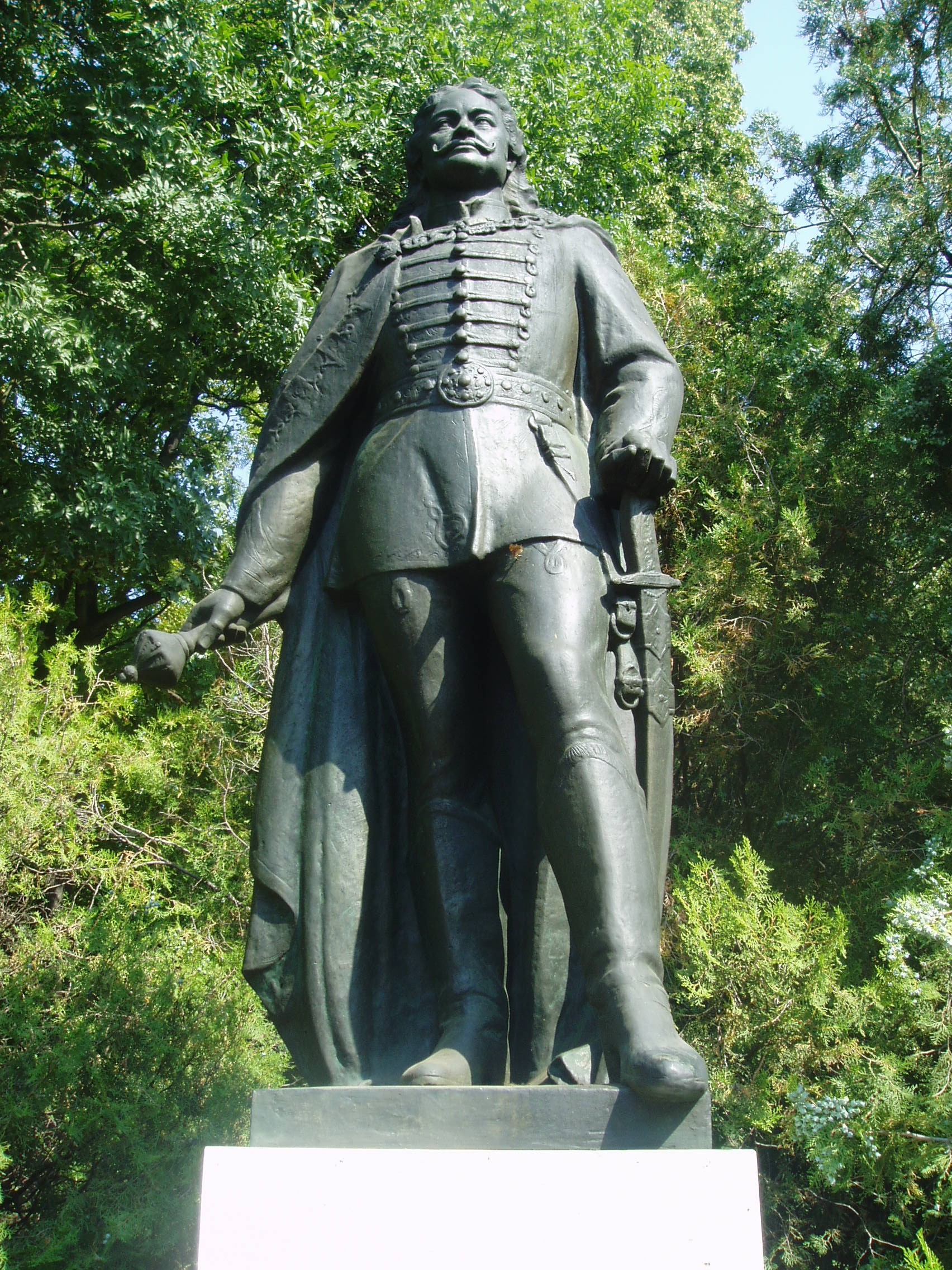 Nyilvános 1232 | 3112 | Sárospatak, Iskolakert bejárat: II. Rákóczi Ferenc | A Református Kollégium (lásd: Sárospatak, Rákóczi u. 1.) bejáratával szemben találjuk a hét hektáros Iskolakertet. Bejáratát két emlékmű fogja közre. II. Rákóczi Ferenc fejedelem egész alakos, bronz szobrát 1935-ben készítette Horváth Géza szobrászművész. A fénykép 2007 augusztusában készült. Felh. irod.: Látnivalók Borsod-Abaúj-Zemplén megyében. Miskolc, Well-PRess, 1995 |