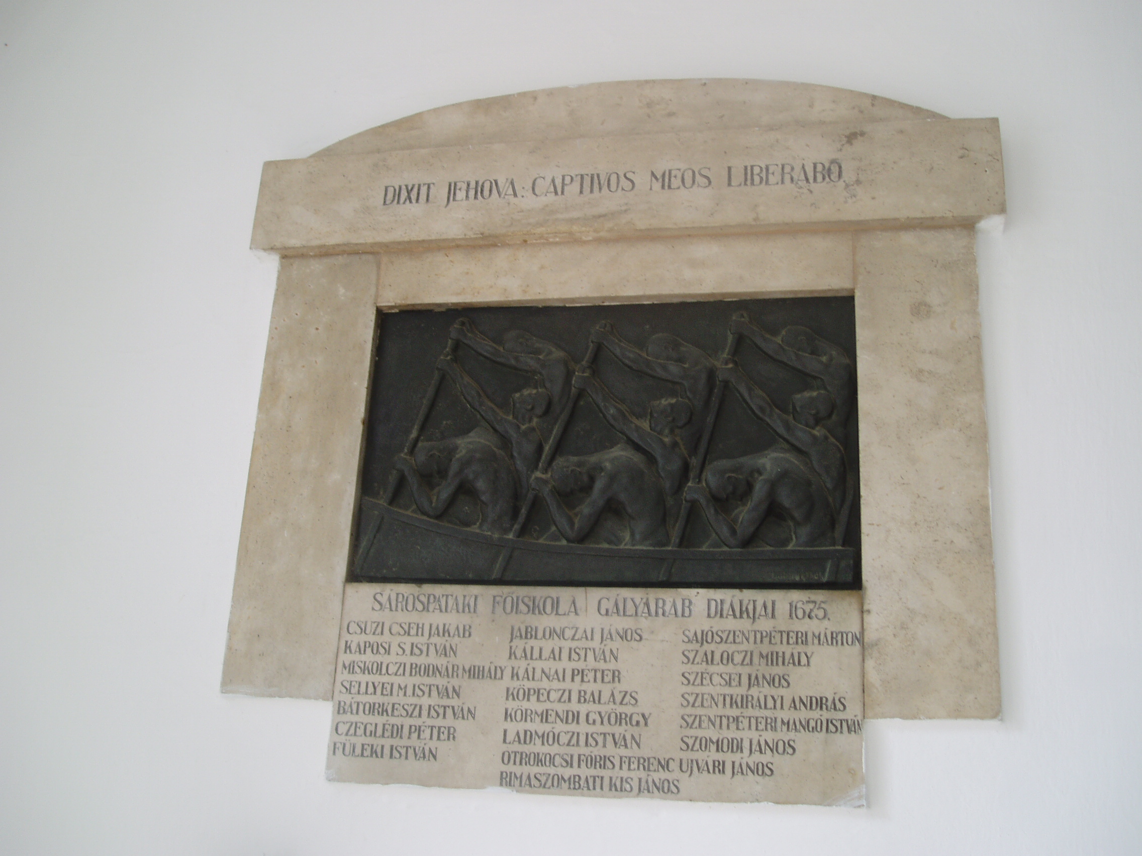 Nyilvános 949 | 1512 | Sárospatak, Rákóczi utca 1. Református Kollégium | A kollégium főépülete, a Nagy Kollégium a Rákóczi út északi végén található, mely 1804–1814 között korai klasszicista stílusban épült. Szép ráccsal ellátott, háromíves nyílású kapuzat vezet be az un. „nagyportá”-ba, amelyet két sor vaskos pillér három hajóra oszt. Kétoldalt a falakon az iskolatörténet néhány fontosabb eseményének, illetve a kollégium nagy alakjainak bronz domborművű ábrázolásait helyezték el. A képen a pataki kollégium gályarab diákjainak emléktáblája látható (Dabóczy Mihály alkotása, 1930-as évek vége). 1673-ban, a Wesselényi-összeesküvés (lásd: Sárospatak, Szent Erzsébet u. 19. Sub Rosa) leleplezése után I. Lipót császár református papokat és tanítókat ítélt gályarabságra. Közülük huszonketten pataki diákok voltak. Az ellenreformáció áldozatait 1676. február 11-én Ruyter holland admirális váltotta ki a rabságból és küldte haza (lásd még: Hajdú-Bihar megye/Debrecen, Emlékkert). A fénykép 2007 augusztusában készült. Felh. irod.: Détsy Mihály: Sárospatak. Bp. Corvina, 1974 Látnivalók Borsod-Abaúj-Zemplén megyében. Miskolc, Well-PRess, 1995 www.sarospatak.hu/nevezetessegek |
