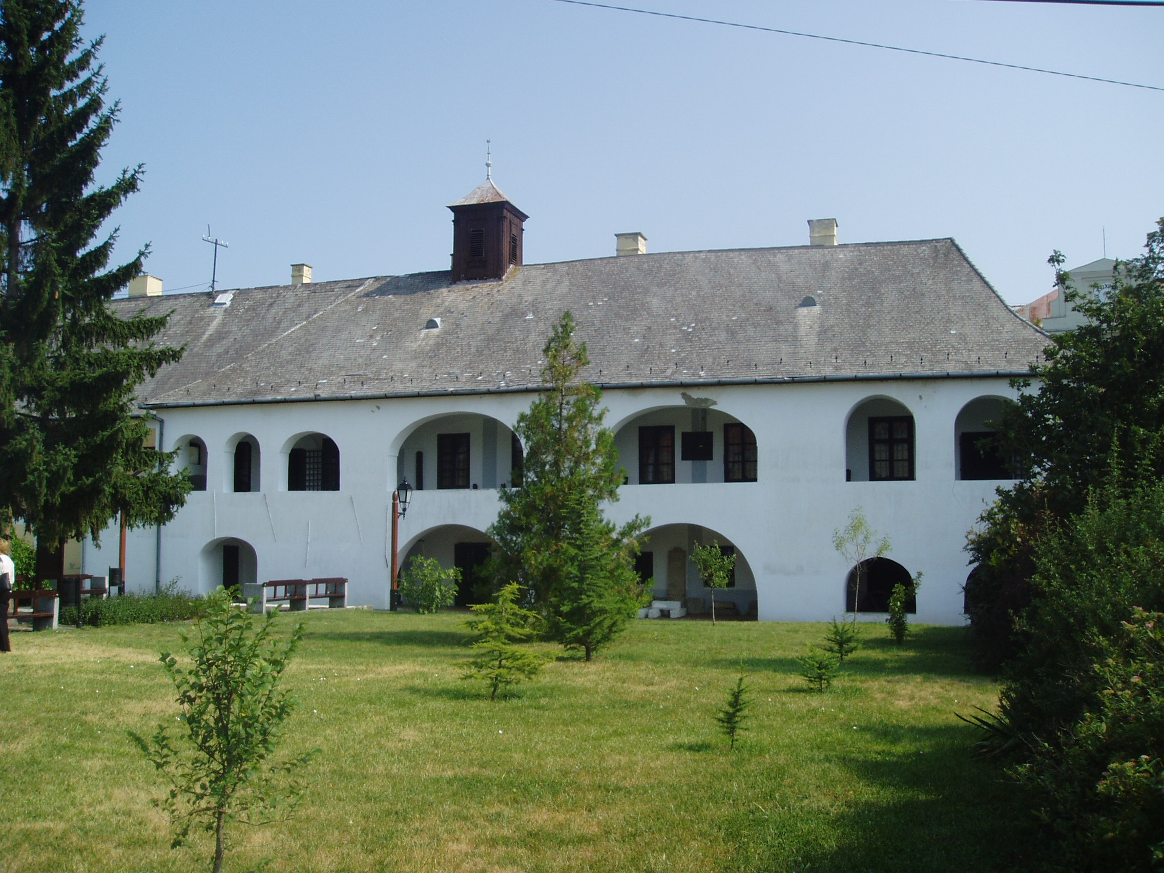 Nyilvános 894 | 1421 | Sárospatak, Rákóczi utca 1. Református Kollégium | A Kollégium főépületének szárnyai által határolt tágas udvarban áll a régi iskolaépületek utolsó maradványa, az ún. Berna-sor. 1771/72-ben a fizika oktatása számára és a fizikaprofesszor lakásául épült. Az egyemeletes, hosszú szárny déli oldalát később kétszintes, árkádos tornáccal bővítették, feljáróval a nyugati oldalon. Az épület a korabeli provinciális magyar építészet szép példája. Az emelet boltozott termeiben a kollégium történetét bemutató kiállítás látható. A fénykép 2007 augusztusában készült. Felh. irod.: Détsy Mihály: Sárospatak. Bp. Corvina, 1974 |