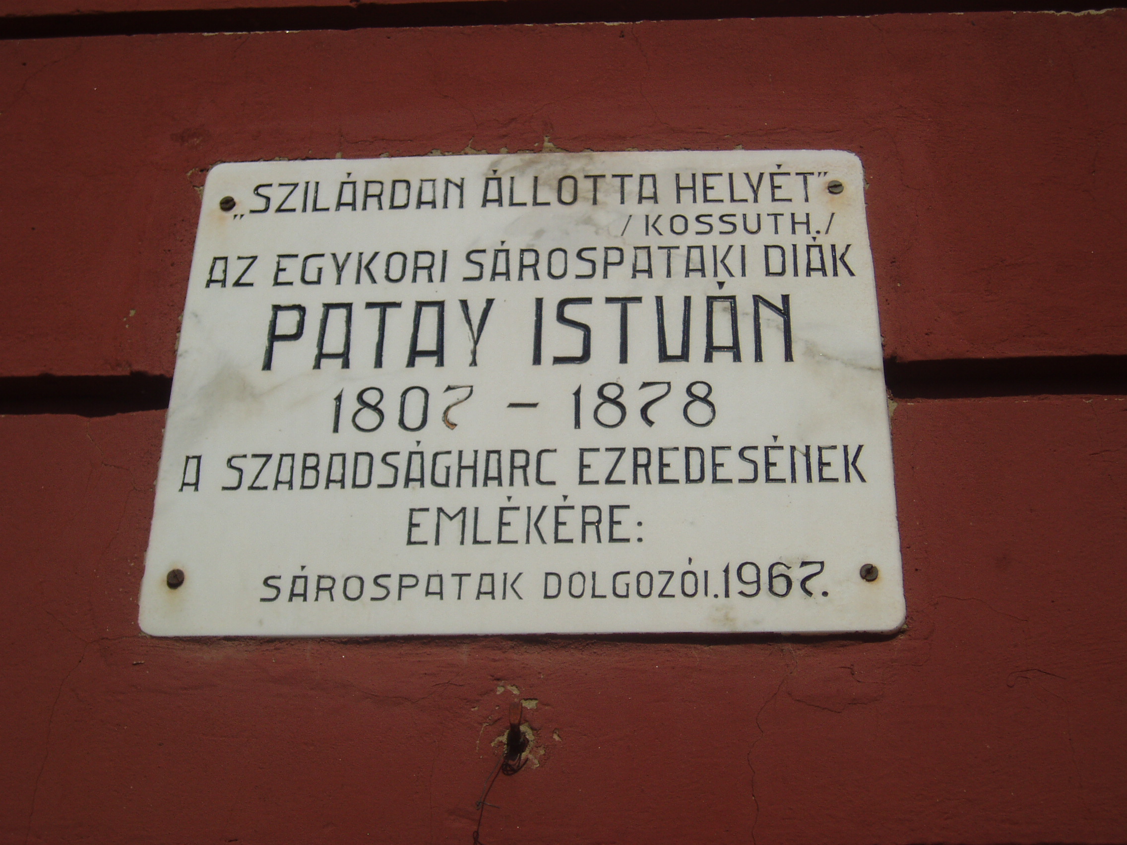 Nyilvános 915 | 1372 | Sárospatak, Rákóczi utca 32. | A volt Esze Tamás Általános Iskola épületének falán márványtábla őrzi az egykori pataki diák, Patay István (1807-1878), a szabadságharc ezredesének emlékét. Az 1848-as Patay István a forradalom idején közhonvédként lépett a hadseregbe, ahol egészen az ezredesi kinevezésig jutott. 1849-ben Pest–Buda ostromakor Pest város katonai és polgári térparancsnoka volt. Sárospatak több ponton is kapcsolódik az 1848-49-es forradalomhoz és szabadságharchoz. A híres pataki iskolában a diákság és a tantestület egy emberként állt a szabadság ügye mellé. Nemzetőrséget szerveztek, többen részt vettek a harcokban is. Az akkori események ismert és kevéssé ismert személyiségei közt több pataki kötődésűt is találunk, akik itt éltek, tanultak (Kossuth Lajos, Szemere Bertalan, Kazinczy Lajos, Tompa Miháy és mások). A fénykép 2007 augusztusában készült. Felh. irod.: Honismeret 2002. 6. |