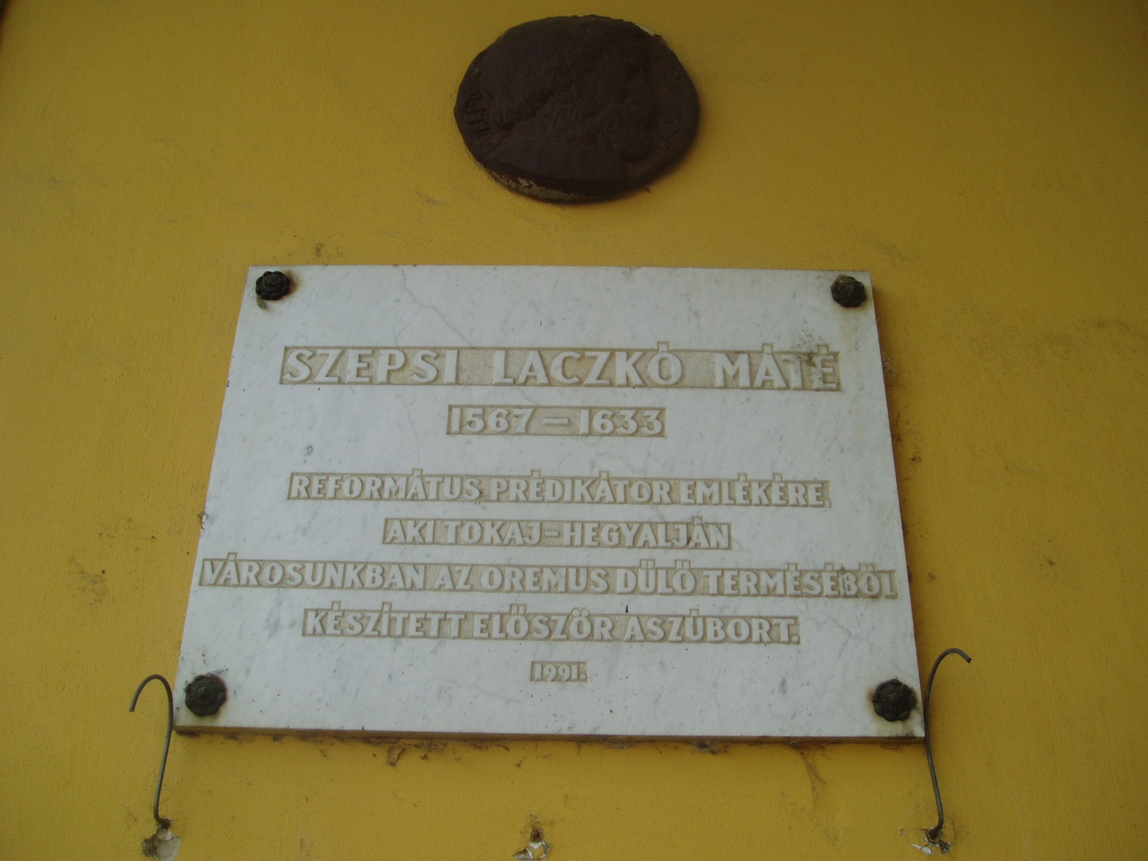 Nyilvános 915 | 1456 | Sátoraljaújhely, Kossuth tér 24. | A város fő terének egyik szép, régi épületén elhelyezett emléktábla szerint elsőként Sátoraljaújhelyen készített tokaji aszút 1631 körül Szepsi Laczkó Márton (1567-1633) református prédikátor, Lórántffy Zsuzsanna udvari lelkésze a fejedelemasszony számára az Oremus dűlő terméséből. A hagyomány szerint az országot érő támadások miatt későn szüretelt szőlő tartalmazott olyan „beteg” szőlőszemeket is amelyeket ma az aszú készítéséhez használnak. Az elkészült, miseborként is használt italban fedezte fel Szepsi Laczkó Máté a különleges ízvilágot és ajánlotta fel a bort a fejedelemasszonynak. Az aszú készítésének első leírását is neki tulajdonítják. A hagyománynak azonban ellentmond, hogy már az 1590-es években - Szikszai Fabricius Balázs latin–magyar szótárában - használták az „aszú szőlő” kifejezést. A fénykép 2007 augusztusában készült. Felh. irod.: www.tokaj.hu/magyar/atokaji/az-aszu/index.php |