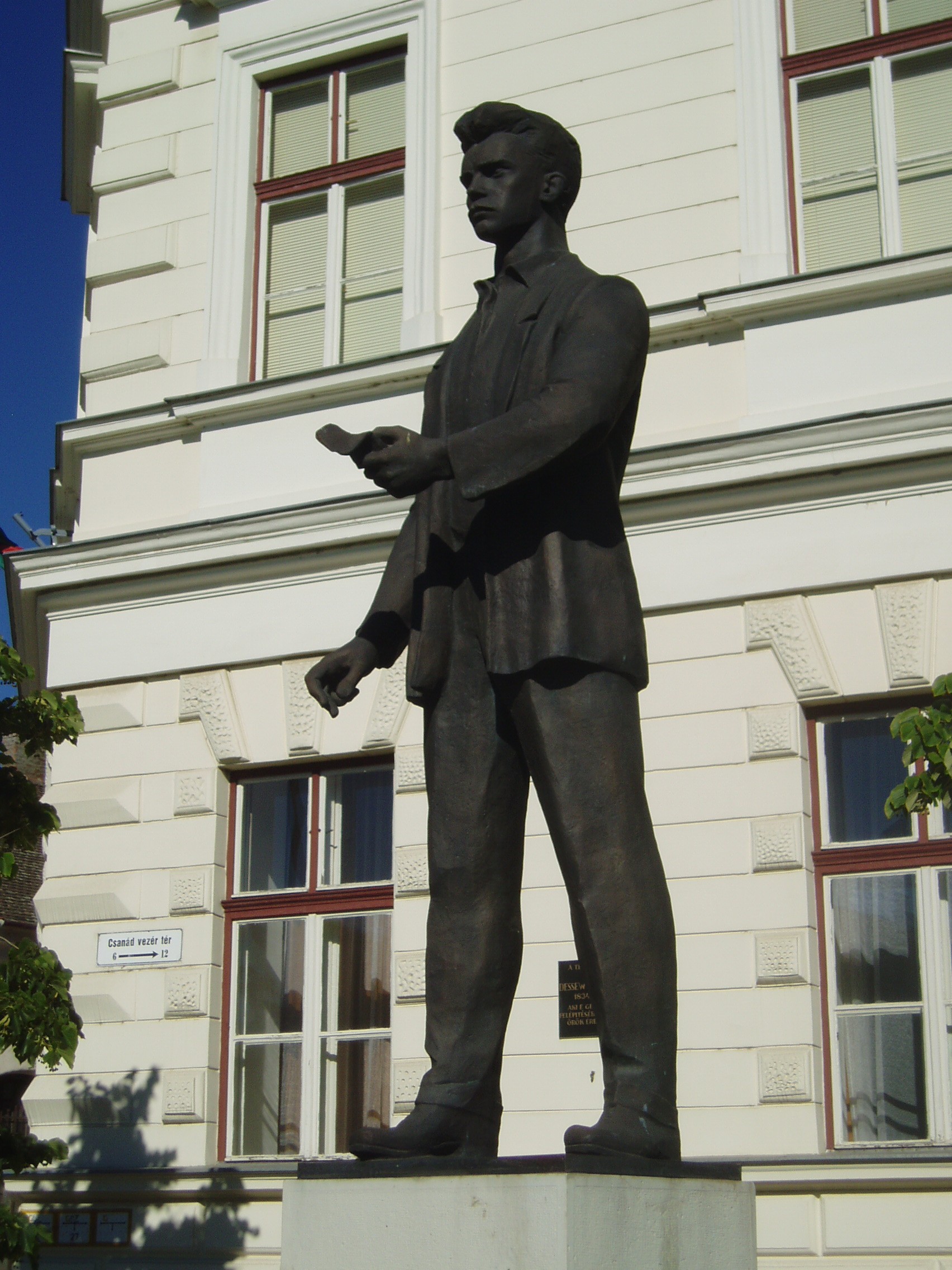 Nyilvános 1013 | 1567 | Makó, Csanád vezér tér 6. József Attila Gimnázium | A város központjából északra nyílik a sugárútszerű Csanád vezér tér. Nyugati oldalán áll a József Attila Gimnázium 1895-ben, eklektikus stílusban, Gerle Lajos tervei alapján emelt épülete. Itt tanított négy évig Juhász Gyula, itt tanult József Attila, majd Erdei Ferenc. A tizenöt és fél éves József Attila 1920 októberében érkezett Makóra. Verseire Juhász Gyula figyelt fel, akinek pártfogása révén a nyugat is közölt néhányat belőlük. Makói diák volt, amikor tizenhét éves korában Szegeden megjelent első verseskötete, a "Szépség koldusa", Juhász Gyula prófétikus előszavával: "A legnagyobb készséggel és örömmel vállalkoztam arra, hogy József Attila első verses könyvéhez előszót írjak. Ez a nagyon fiatal és nagyon tehetséges költő a legteljesebb mértékben megérdemli, hogy a figyelem feléje forduljon, hogy igaz szeretettel és reménységgel fogadja a magyar olvasóközönség és hogy a kritika se menjen el mellette közömbösen vagy ellenségesen és ne elégedjék meg vele szemben a nyomtatásban megjelenőknek rendesen kijáró vállveregetéssel. József Attila Isten kegyelméből való költő." Az épület előtt áll 2005-ben, születése centenáriumán újjáavatott szobra, a járdába ágyazottan pedig első verseskötetének bronzba öntött címlapja idézi emlékét. A fénykép 2007 júliusában készült. Felh. irod.: Barangolások Csongrád megyében. Miskolc, Well-PRess, 1997 |