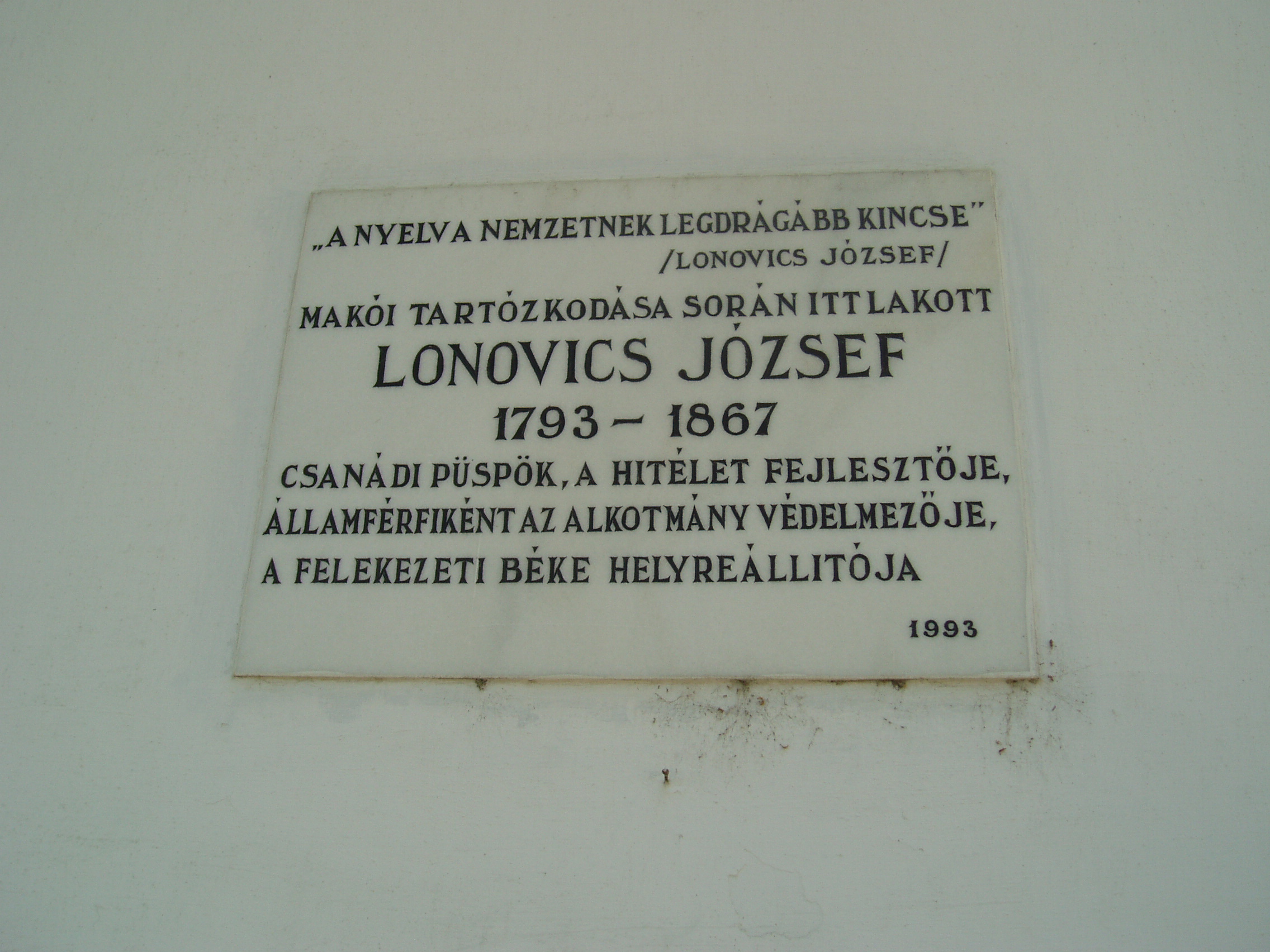 Nyilvános 958 | 1401 | Makó, Csanád vezér tér 12. | A volt püspöki nyaralókastélyt a Temesvárott lakó Kőszeghy László csanádi püspök emeltette 1826-ban a hozzá csatlakozó dór oszlopos kápolnával együtt. A külső homlokzaton jeles, az épülethez kötődő csanádi püspökök, illetve püspöki helynök emléktábláit helyezték el. Lonovics József (1793-1867) csanádi püspök, majd egri, illetve kalocsai érsek emléktábláját születésének 200. évfordulóján állították. A fénykép 2007 júliusában készült. Felh. irod.: Barangolások Csongrád megyében. Miskolc, Well-PRess, 1997 |