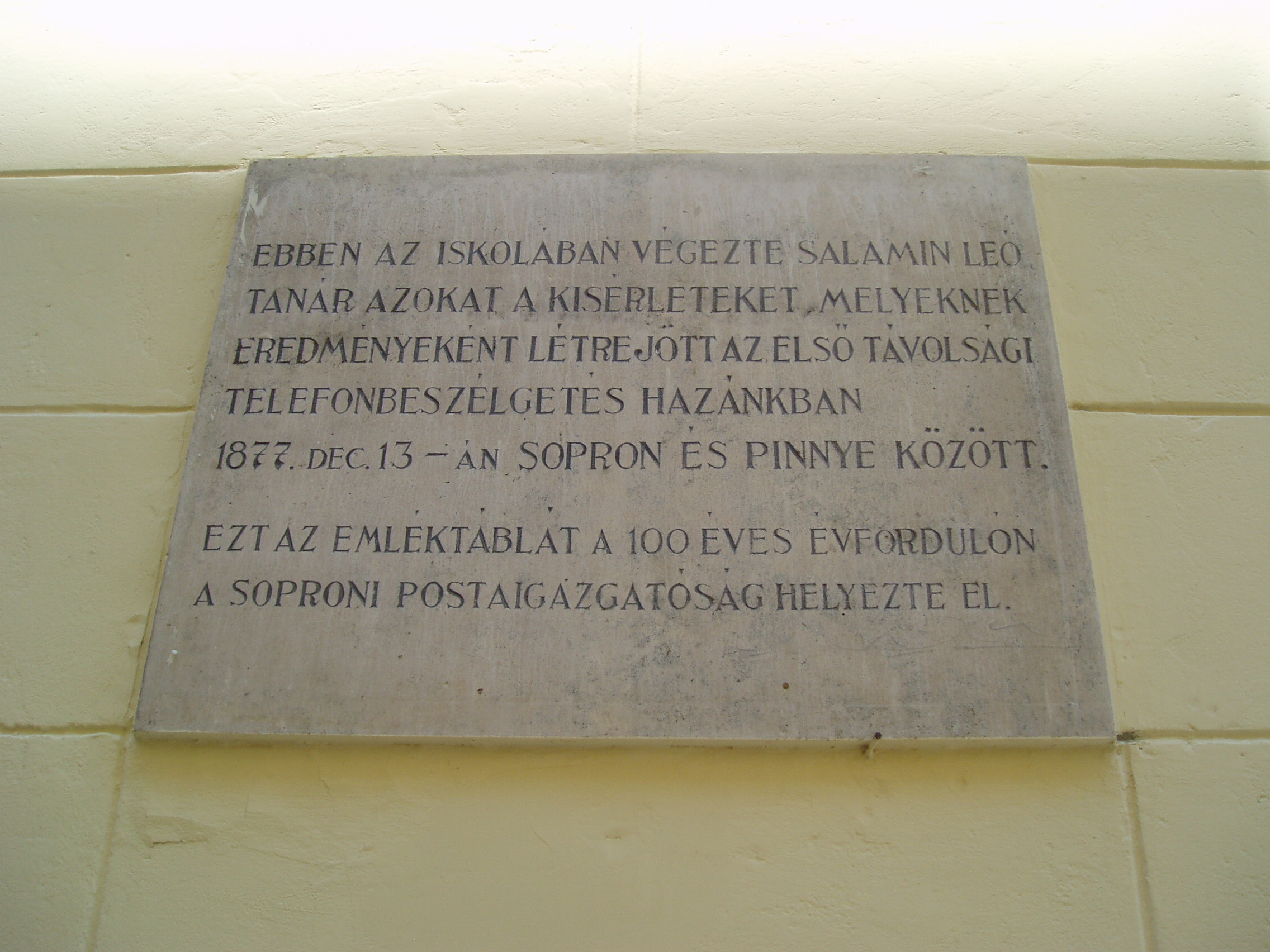 Nyilvános 954 | 1302 | Sopron, Liszt Ferenc utca 2. | A Széchenyi István Gimnázium eredetileg reáliskola volt, amelyet 1850-ben alapítottak. Az épületen a soproni Postaigazgatóság által elhelyezett emléktábla megörökíti, hogy ebben az iskolában végezte Salamin Leó tanár azokat a kísérleteket, melyeknek eredményeként létrejött az első távolsági telefonbeszélgetés hazánkban 1877. december 13-án Sopron és Pinnye között. A kép 2008 júniusában készült. |