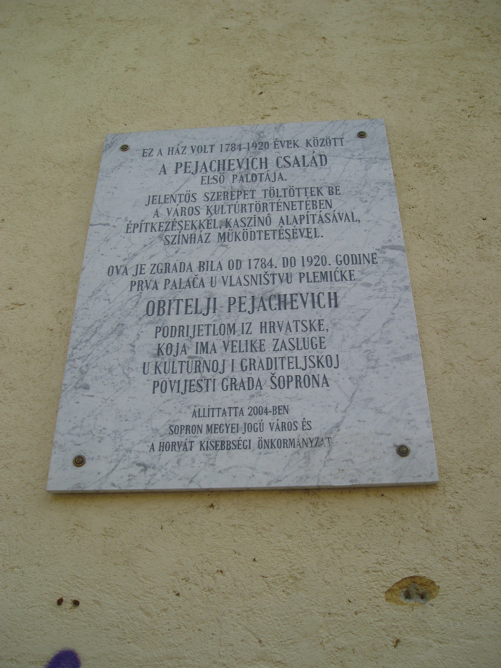 Nyilvános 890 | 1453 | Sopron, Petőfi tér 5. | A Pejachevich-palota valószínűleg már állt a XVII. század végén. 1786-ban vette meg, majd építtette át Pejachevich Károly. A XIX. században is a család birtokolta, amely jelentős szerepet játszott Sopron művelődéstörténetében a kaszinó (lásd: Petőfi tér 3.) és a színház (lásd: Liszt Ferenc utca 2.) alapításával és működtetésével. Falai között járt 1801-ben József nádor és felesége, Alexandra Pavlovna. Mint egy emléktábla is megörökíti, 1893 és 1896 között itt nevelkedett a leendő IV. Károly magyar király. A kép 2008 júniusában készült. Felh. irod.: Czellár Katalin: Sopron. 3. jav. kiad. Bp. Panoráma, 2000 |