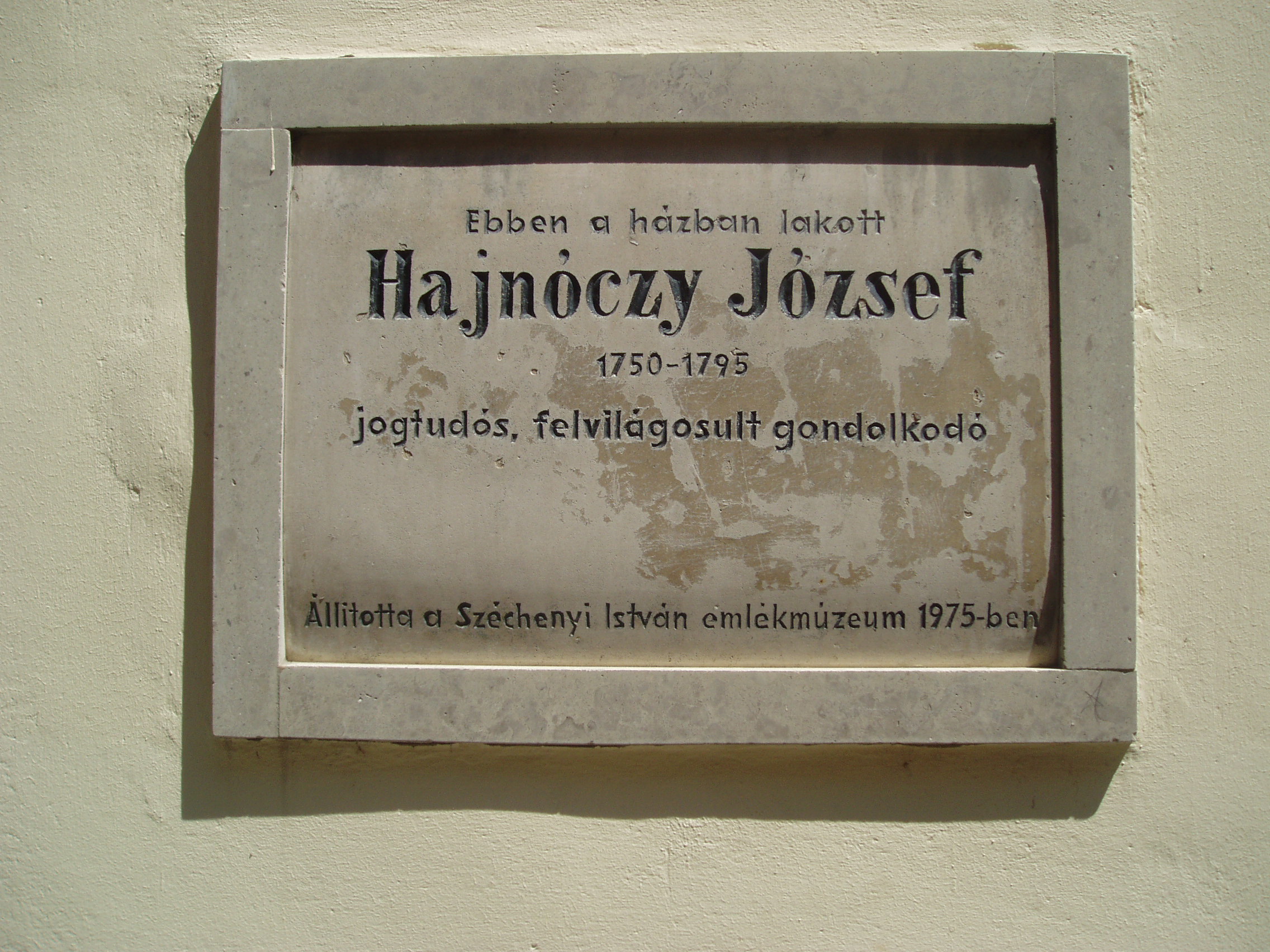 Nyilvános 901 | 1268 | Sopron, Templom utca 19. | Középkori eredetű, egyszerű, egyemeletes lakóház. 1734-ben Hajnóczy Dániel, a neves tanár és hitszónok tulajdona volt. Az épületen emléktábla hirdeti, hogy ebben a házban lakott Hajnóczy József (1750-1795) jogtudós, felvilágosult gondolkodó. Apja Hajnóczy Sámuel evangélikus lelkész volt. Hajnóczy részt vett a Martinovics-féle összeesküvésben, amiért Budán lefejezték. A kép 2008 júniusában készült. Felh. irod.: Czellár Katalin: Sopron. 3. jav. kiad. Bp. Panoráma, 2000 |