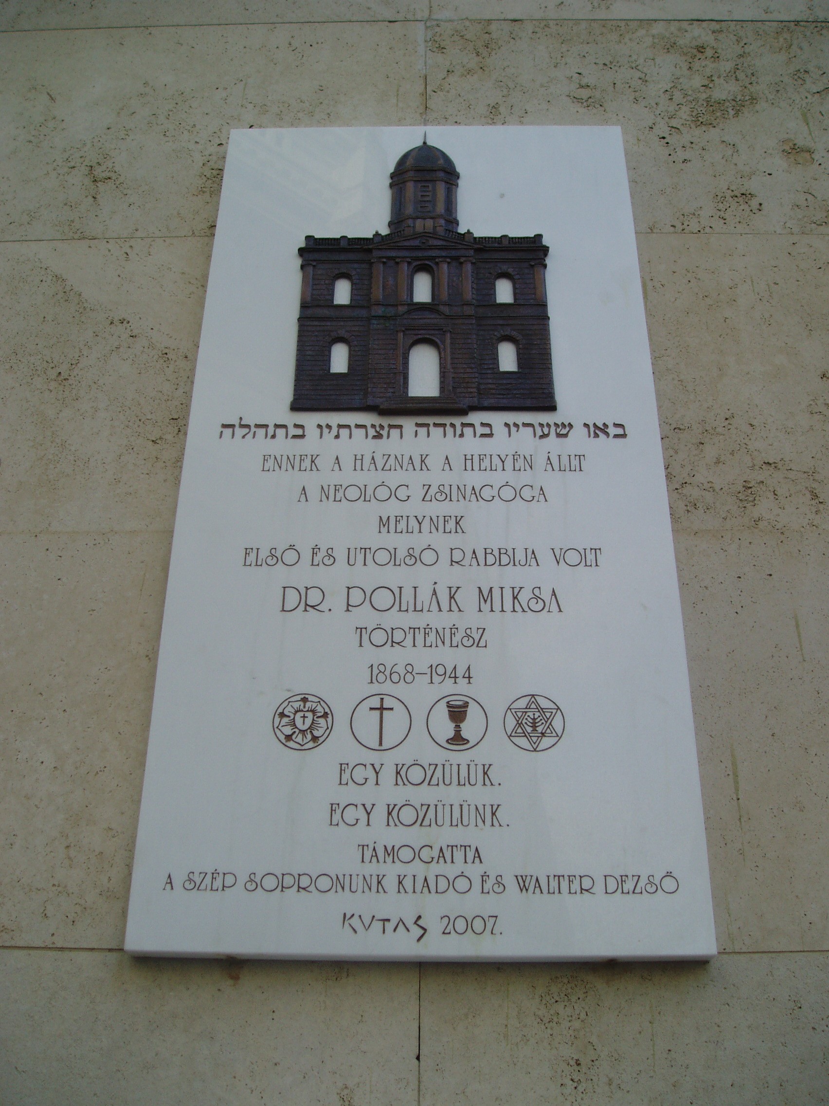 Nyilvános 920 | 1347 | Templom utca 23. | Egykor ezen a helyen állt a neológ zsinagóga, amelyet Schámár János épített neoreneszánsz stílusban. Első és utolsó rabbija dr. Pollák Miksa (1868-1944) volt, aki történészként megírta a soproni zsidóság történetét. A mostani lakóházat Winkler Oszkár tervezte, 1960-ban épült fel. A neológ zsinagóga emléktáblája mellett az épületen egy másik tábla Pap Károly író alakját idézi fel, aki 1897. szeptember 24-én itt született, Pollák Miksa fiaként. A magyar irodalom egyik legeredetibb hangú prózaírója a buchenwaldi haláltáborban pusztult el. A kép 2008 júniusában készült. Felh. irod.: Czellár Katalin: Sopron. 3. jav. kiad. Bp. Panoráma, 2000 Hegedűs Géza: A magyar irodalom arcképcsarnoka. Bp. Trezor, 1992 |