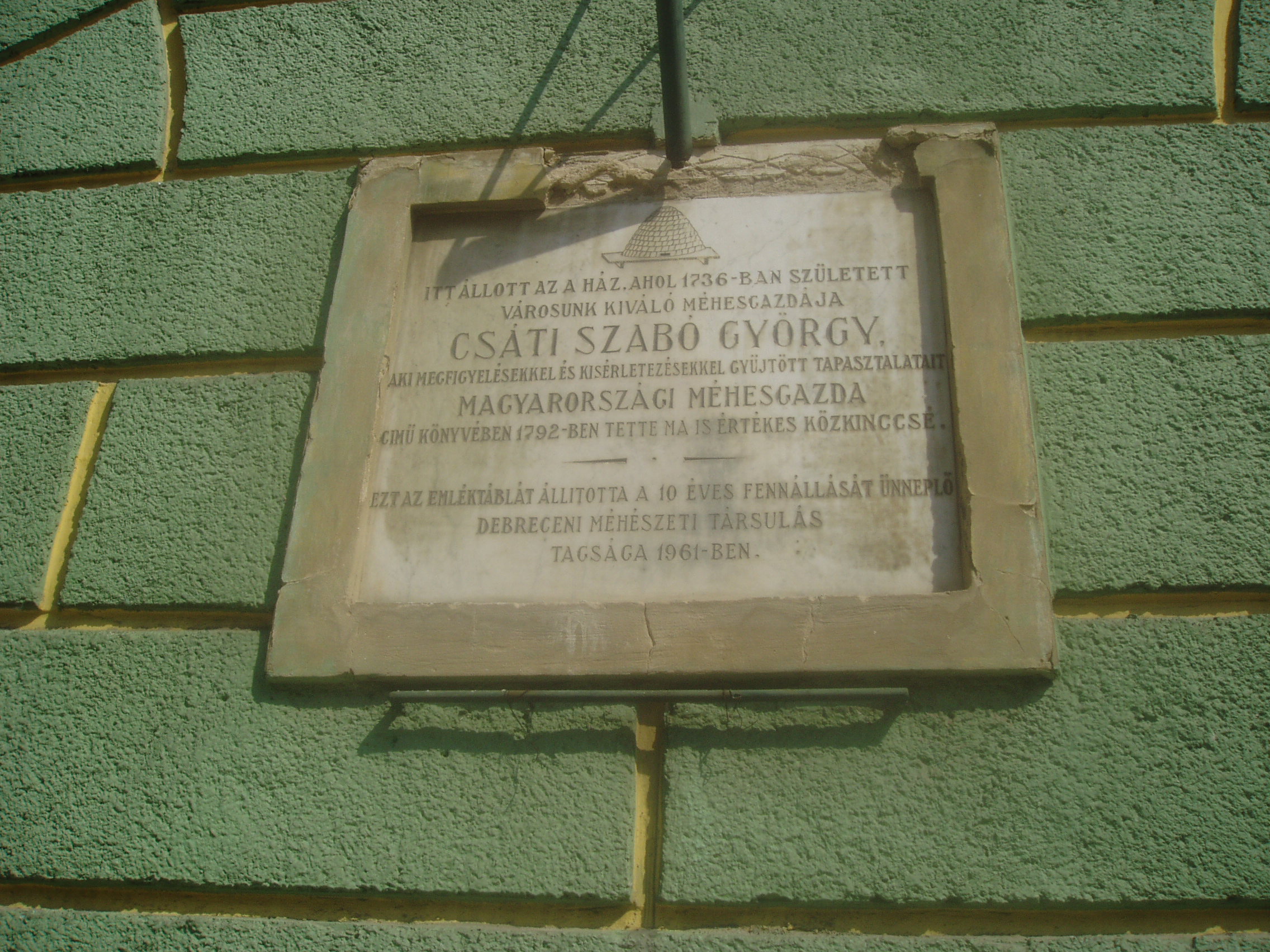 Nyilvános 1346 | 3103 | Debrecen, Csapó utca 1. | A mostani épületen emléktábla adja tudtul, hogy az egykor ezen a helyen állott házban született 1736-ban Csáti Szabó György, Debrecen kiváló méhesgazdája. A fénykép 2006 júniusában készült. |