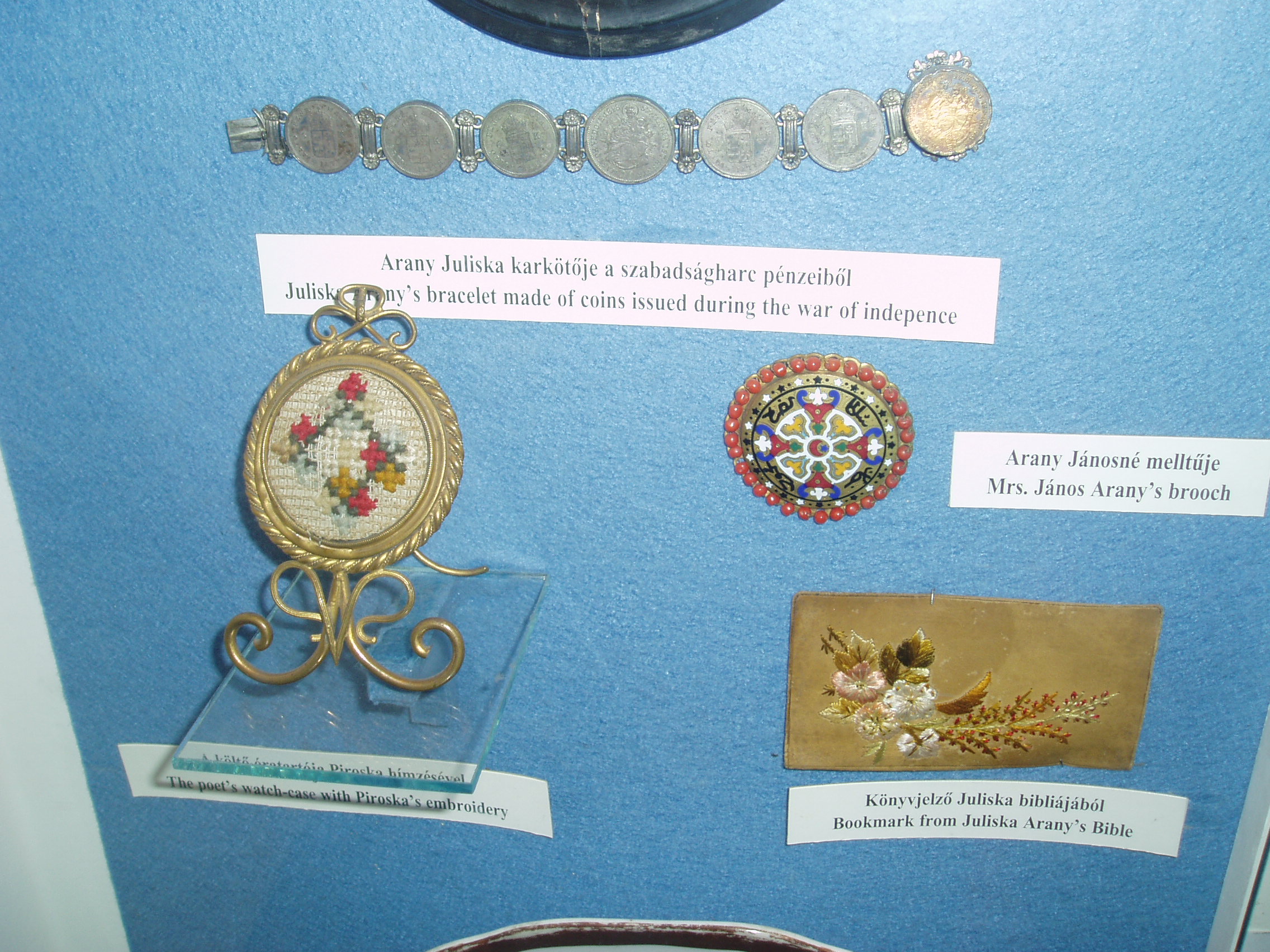 Nyilvános 1422 | 3071 | Nagykőrös, Ceglédi út 19. Arany János Múzeum | Arany János 1851 és 1860 között élt Nagykőrösön, magyart tanított a helyi gimnáziumban. A városban fennmaradt s Arany halála után a családja által adományozott relikviákból 1910-ben Arany-emlékszobát rendeztek be Arany egykori működésének helyén, a gimnáziumban. Később e relikviák az 1928-ban alapított városi, Arany János Múzeumba kerültek. A képen látható, 48-as pénzérmékből készült karkötőt a költő leánya, Juliska Nagykőrösön is viselte. A fénykép 2006 augusztusában készült. Felh. irod.: www.c3.hu/~pmiajm/hunnagyk.htm www.vendegvaro.hu Novák László: Arany János Múzeum. Nagykőrös, 2000 Törös László: A nagykőrösi Arany emlékek katalógusa. = A nagykőrösi művelődés hármas kis tüköre. Nagykőrös, 1935 |
