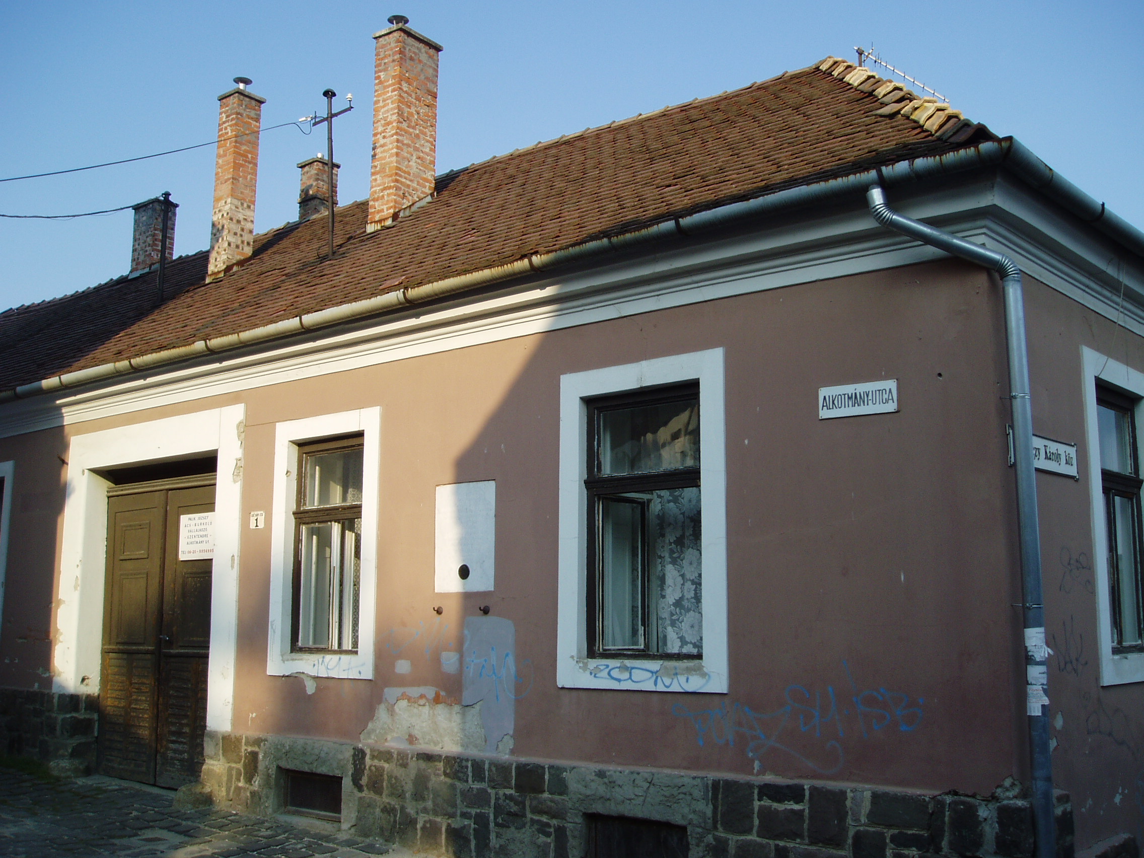 Nyilvános 1301 | 3140 | Szentendre, Alkotmány utca 1. | Ebben a házban élt 1889 és 1892 között Ferenczy Károly festőművész és felesége, Fialka Olga festőművész. 1890-ben itt születtek ikergyermekeik, akik mindketten halhatatlan alakjai a magyar képzőművészetnek: Ferenczy Béni szobrászművész és Ferenczy Noémi gobelinművész. A család legidősebb gyermeke, az 1885-ben született Ferenczy Valér is festőművész volt. A fénykép 2005 szeptemberében készült. |