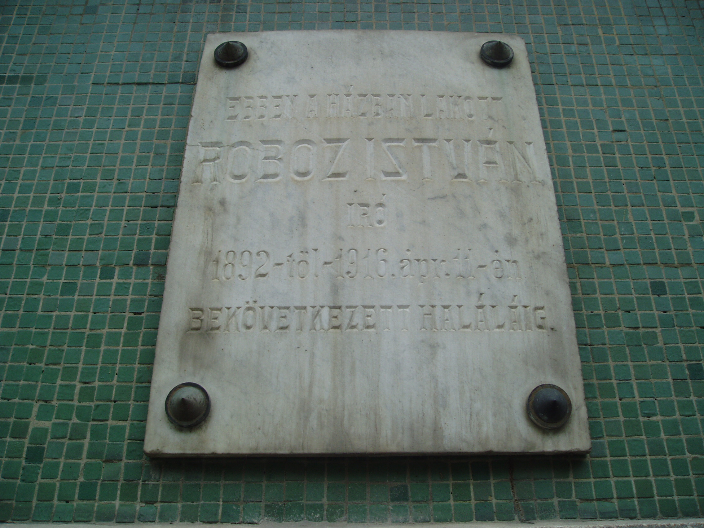 Nyilvános 1015 | 2027 | Kaposvár, Dózsa utca 16. | A korábban ezen a helyen állott házban lakott 1892-től 1916-ban bekövetkezett haláláig Roboz István író, szerkesztő. Halála után az eredeti épületet emléktáblával jelölték meg, amelyet 1996-ban áthelyeztek az itt felépített új épületre, egy kiegészítő szöveges táblával együtt. Roboz István (Kötcse, 1828. okt. 26. - Kaposvár, 1916. ápr. 11.): költő, író, újságíró. Pápán Petőfi és Jókai iskolatársa volt. Diákéveit "Petőfi Sándor és az én pápai emlékeim" című, forrásértékű visszaemlékezéseiben örökítette meg. A szabadságharc alatt kormánybiztosi titkár Kaposvárott. Végleg 1856-ban telepedett le a városban, ahol először törvényszéki bíróként, később főjegyzőként dolgozott. Nagy aktivitással kapcsolódott be a dél-dunántúli irodalmi életbe. 1866-ban megalapította a Somogy című lapot, amelyet haláláig szerkesztett. Elnöke volt a Somogy vármegyei Berzsenyi Társaságnak. Ő írta - a hagyomány szerint az ádándi kastélyban - 1849-ben a később több nyelvre is lefordított "Kossuth imája a kápolnai csatában elesettek felett" című verset, amelyet a helyszínen felolvasott Wesselényi Miklósnak és Kemény Zsigmondnak. Az ima az 1850-es években a legismertebb hazafias fohász volt. A fénykép 2006 márciusában készült. Felh. irod.: Életrajzi lexikon www.adand.hu |
