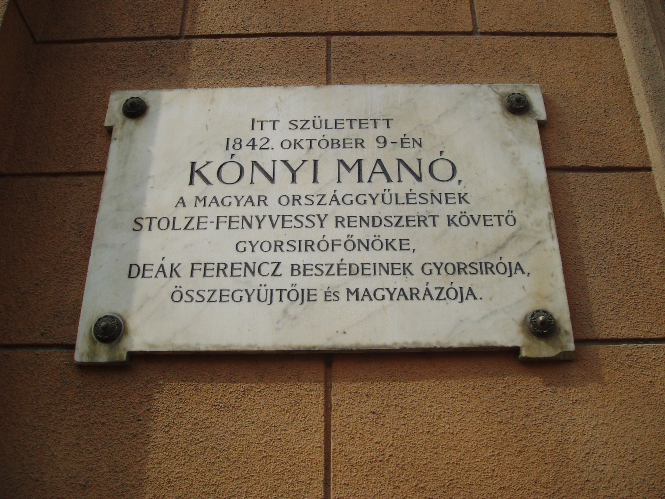Nyilvános 1003 | 1699 | Kaposvár, Kossuth tér 5. | Az egykori Erzsébet szálló épületét 1901-ben hat hónap alatt készítették el. A sarokerkély feletti saroktorony, valamint a színes Zsolnay-cserepek a városközpont egyik jellegzetes épületévé teszik. A Noszlopy Gáspár utca felőli homlokzaton Kónyi Manó emléktáblája olvasható, aki a szálló helyén korábban állott épületben született. Szövege a következő: "Itt született 1842. október 9-én Kónyi Manó, a magyar országgyűlésnek Stolze-Fenyvessy rendszert követő gyorsírófőnöke. Deák Ferenc beszédeinek gyorsírója, összegyűjtője és magyarázója." A fénykép 2006 márciusában készült. Felh. irod.: Látnivalók Somogy megyében. Miskolc, Well-PRess, 2000 |
