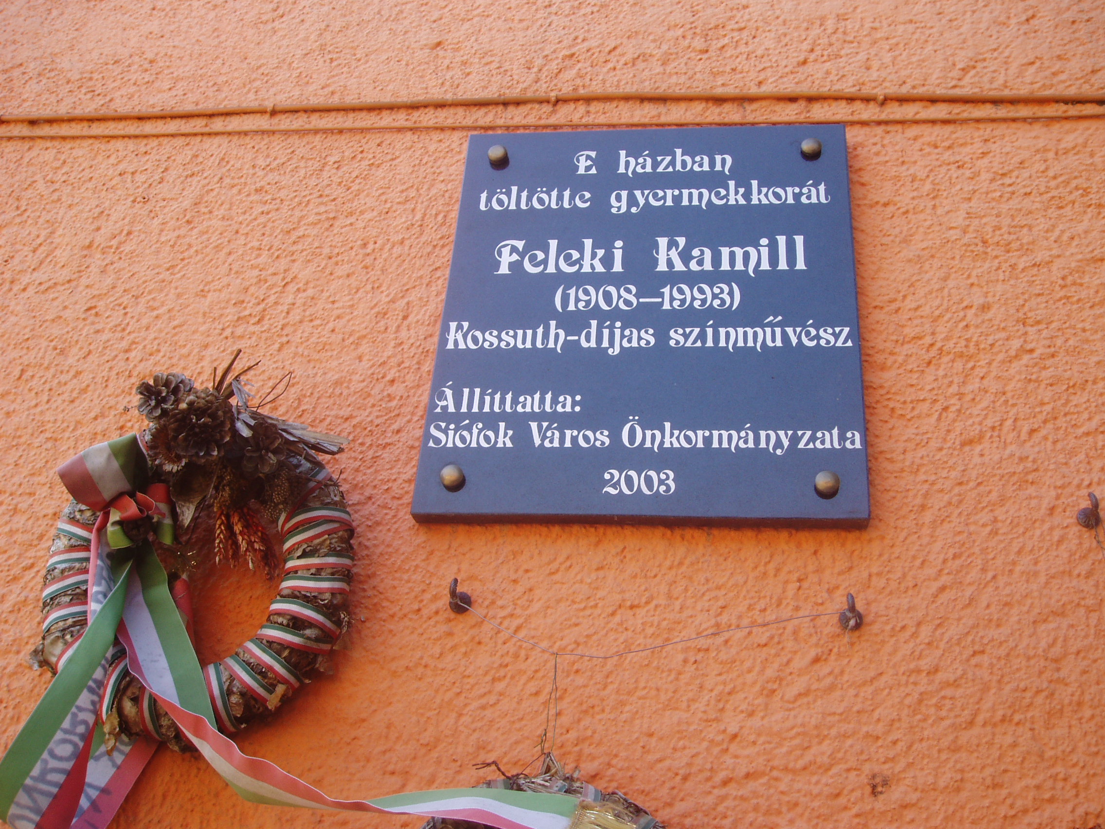 Nyilvános 1095 | 2203 | Siófok, Kálmán Imre sétány 3. | A város szívében, a sétálóutca központi részén található az egykori Kovács cukrászda, amely ma Siófok egyik legkellemesebb hangulatú étterme. Homlokzatán Feleki Kamillra, az operett műfajának kimagasló egyéniségére emlékező fekete márványtábla fogadja a sétálót, aki gyermekkorában ebben a házban töltötte nyarait testvéreivel együtt. A házban apai nagyszülei vezették az akkori vendéglőt. A fénykép 2006 júliusában készült. Felh. irod.: Matyikó Sebestyén József: Feleki Kamill és Siófok. = Siófoki Hírek 2003. júl. 23. |