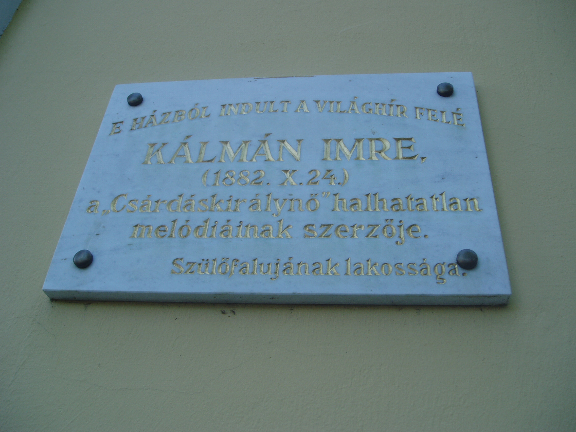 Nyilvános 1030 | 1860 | Siófok, Kálmán Imre sétány 5. | Ebben a vasútállomáshoz közeli házban született 1882-ben a magyar operett egyik legjelentősebb zeneszerzője, Kálmán Imre. Születése napja bizonytalan, még a család sem tudta eldönteni, hogy október 24-én, vagy 25-én jött-e a világra. Édesapja Koppstein Károly Siófokon gabonakereskedő és vállalkozó volt. Édesanyja Singer Paula - szelíd, művészlelkű asszony - megérte fia világhírét. Kálmán Imre a harmadik gyerekként született. Nevét később, a gimnáziumi évek alatt magyarosította Kálmánra. A kis Imre korán tanújelét adta zenei érdeklődésének, tehetségének, amit a családból hozott magával: felmenői között anyai ágon muzsikusok, apai ágon kiváló rabbik, tanítók voltak. Még nem volt hat éves, amikor egy nyáron náluk vett ki szobát Liedl Ferenc hegedűművész, tőle kapott először a kisfiú zenei leckéket. Gyermekként járt először színházban is, a házuk közvetlen szomszédságában egykor állott Nyári Színkörben (lásd: Siófok, Kálmán Imre sétány 6.). Elemi iskolai tanulmányait az egytanerős izraelita népiskolában végezte. Első hivatásos zenetanára még elemista korában a helybeli Remcsák Antal volt. Elemi iskoláinak befejeztével Budapesten tanult tovább a Deák téri Evangélikus Főgimnáziumban. Közben édesapja üzleti vállalkozásai teljesen tönkrementek, mindenüket elárverezték, s a család elhagyta Siófokot. Kálmán Imre a budapesti Zeneakadémián végzett tanulmányai mellett családi követelésre jogot is hallgatott. S bár a Zeneakadémián — ahol évfolyamtársa volt például Bartók Béla — még szimfóniákról álmodott, operettszerzőként lett világhírű. Siófoki szülőházában — amelyet először 1955-ben jelöltek meg emléktáblával — 1970-ben özvegye, Kálmán Vera jelenlétében avattak emlékszobát. A mostani, gazdagabb anyagú emlékmúzeumot a zeneszerző születésének 105. évfordulója alkalmából, 1987. október 22-én nyitották meg. Jelenleg az emlékmúzeum a szülőház földszinti termeiben található, az emeleten kortárs képzőművészeti időszaki kiállításokat szoktak rendezni. A fénykép 2006 júliusában készült. Felh. irod.: Kálmán Imre Múzeum Siófok. Szerk. Koch József. Siófok, 2000 http://www.kalmanimre-muzeum.hu/ |