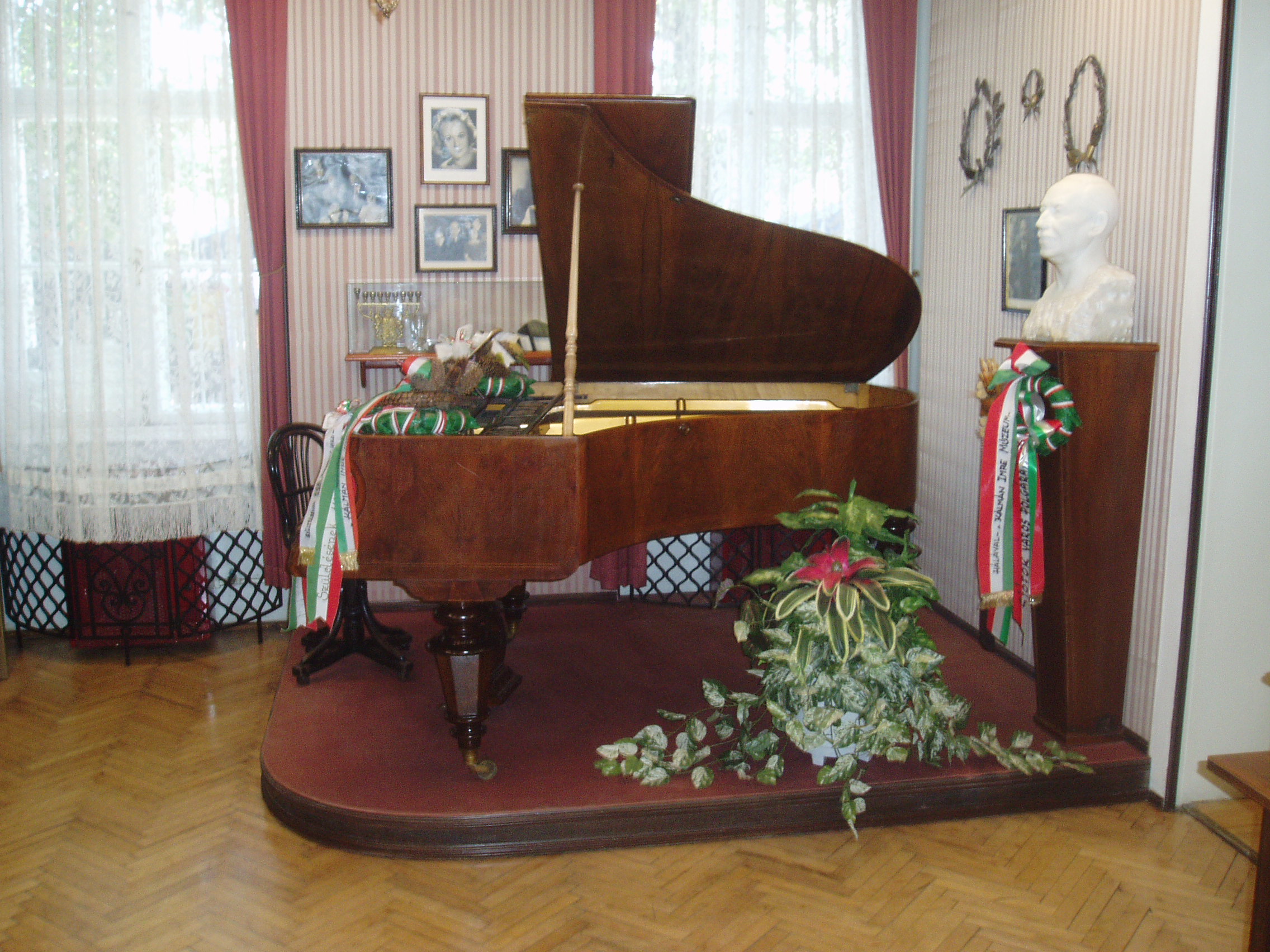 Nyilvános 1092 | 1916 | Siófok, Kálmán Imre sétány 5. | Ebben a vasútállomáshoz közeli házban született 1882-ben a magyar operett egyik legjelentősebb zeneszerzője, Kálmán Imre. Szülőházában — amelyet először 1955-ben jelöltek meg emléktáblával — 1970-ben özvegye, Kálmán Vera jelenlétében emlékszobát avattak. A mostani, gazdagabb anyagú emlékmúzeumot a zeneszerző születésének 105. évfordulója alkalmából, 1987. október 22-én nyitották meg. Jelenleg az emlékmúzeum a szülőház földszinti termeiben található, az emeleten kortárs képzőművészeti időszaki kiállításokat szoktak rendezni. Az első szoba hűen tükrözi azt a kort, amelyben az operett leendő kiválósága gyermekként, ifjúként élt. Itt látható az a Csupor gyártmányú zongora, amelyet tizenhat éves korában használtan vett összekuporgatott pénzéből, s annyira a szívéhez nőtt, hogy sohasem adta el. Ebben a teremben áll a zeneszerző 1953-ban, E. D. Minazzoli által carrarai márványból készített mellszobra. A fénykép 2006 júliusában készült. Felh. irod.: Kálmán Imre Múzeum Siófok. Szerk. Koch József. Siófok, 2000 http://www.kalmanimre-muzeum.hu/ |