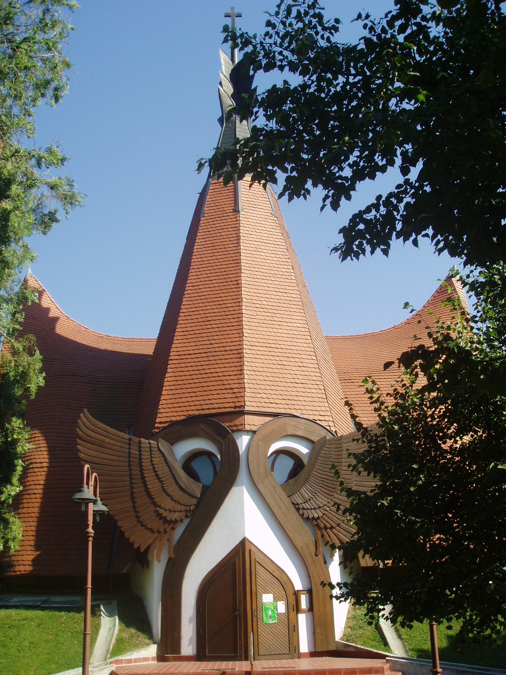 Nyilvános 1033 | 2159 | Siófok, Oulu park: Evangélikus templom | A Siófok finn testvérvárosáról elnevezett parkban található az ország legszebb és legmodernebb evangélikus temploma. Építéséhez a finn testvérváros evangélikus gyülekezete is jelentősen hozzájárult. Az építészetileg igazi különlegességnek számító, a népi építészet hagyományait a legmodernebb eszközökkel ötvöző templom Makovecz Imre tervei alapján 1990-ben épült. Ezen az épületen is, mint Makovecz legtöbb alkotásán a fa - mint természetes építőanyag - dominál. A torony tetején, az életfából kinövő kereszt azt jelképezi, hogy a golgotai kereszt nem a halálé, hanem utat mutat az örök élethez. A négykapus, 120 férőhelyes templom főbejárata fölött angyalszárnyak vigyázzák a belépőt. A keleti tájolású oltár fölött Péterffy László: A feltámadott szobra című alkotása látható. A templom 2004-ben az Aquincumi Orgonagyár által készített hangversenyorgonával gazdagodott. A fénykép 2006 júliusában készült. Felh. irod.: www.vendegvaro.hu Orgonaépítés a siófoki Makovecz-templomban. = Evangélikus Élet 2004. 9. |