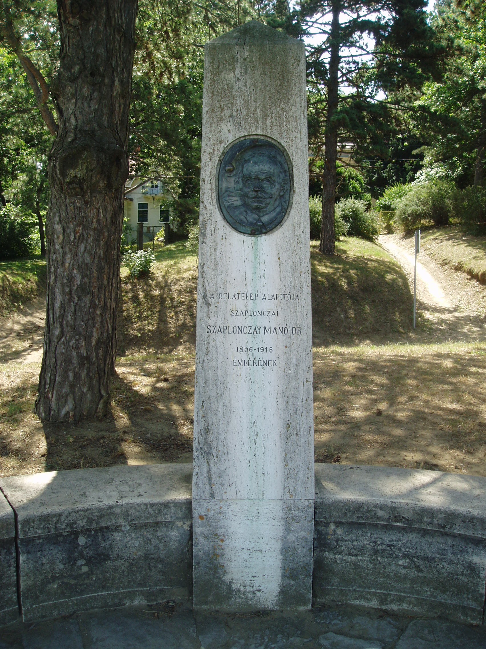Nyilvános 1013 | 2265 | Fonyód, Márffy tér: Szaplonczay Manó emlékoszlopa | A híres Bartók Béla úti fonyód-bélatelepi villasorral átellenben, a sétányon haladva Szaplonczay Manó (1856-1916) emlékoszlopa látható, amelyet Bélatelep alapítója előtt tisztelegve 1934-ben emeltek. Az emlékoszlophoz, amelyet félkörben kőpad vesz körül, öt lépcső vezet. Az emlékművet Gerlóczy Gedeon műépitész tervezte, a rajta elhelyezett bronz-dombormű Horvay János szobrászművész alkotása. Két oldalán gránittáblákat állított a Fonyód Városvédő és Szépítő Egyesület, illetve egy kopjafa is az ő emlékét idézi. Szaplonczay Manó Somogy vármegye tisztifőorvosa volt. Ő építtette a marcali kórházat. Tiszti főorvosként sokat foglalkozott a fertőző betegségekkel, igyekezett terjeszteni a védőoltásokat. Sikerrel küzdött a csecsemőhalandóság ellen is. A fonyódi Várhegyen ő alapította meg a gróf Zichy Béláról (lásd: Fonyód, Bartók u. 3.) elnevezett Bélatelepet, s ezzel sokat tett a Balaton idegenforgalmának megteremtéséért. 1894-ben Kaposváron ötven alapítóval létrehozta a Fonyódi Nyaralók Társaságát. Hatvan éves korában, 1916. szeptember 3-án hunyt el. Ahogy kívánta, az általa alapított Bélatelepen, Balatonra nézve temették el a Várhegyen. A fénykép 2007 júliusában készült. Felh. irod.: http://konyvtar.fonyod.hu/szapmano.htm Szerdán avatták fel Fonyódon a Szaplonczay-emlékművet. = Új Somogy. 1934. augusztus 17 www.somogyitemetkezes.hu/temetok.php?id=179 |