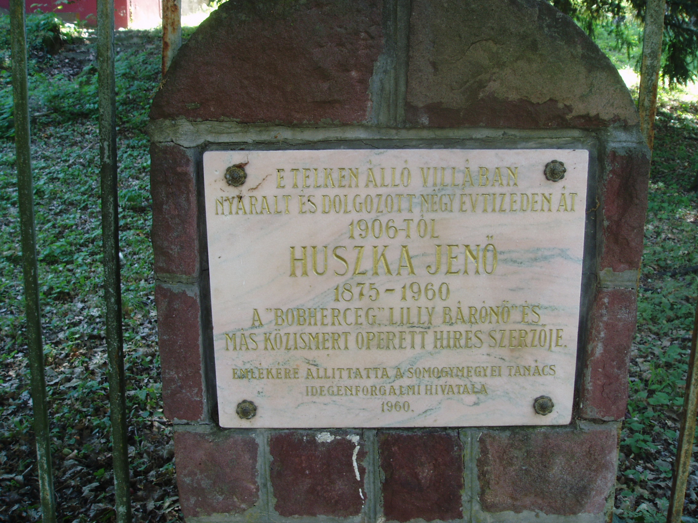 Nyilvános 940 | 1626 | Fonyód, Bartók utca 42. Huszka Jenő villája | A fonyódi magasparton húzódó villasor közepén találjuk Huszka Jenő egykori villáját, ahol csaknem négy évtizeden keresztül, 1907 és 1944 között pihent és alkotott. Huszka először az ettől a villától balra lévő ún. Náray–Szabó–villát vásárolta meg, majd 1906-ban elvette feleségül a mostani Huszka–villa akkori tulajdonosának, Lippich Eleknek a lányát, Leonát. Amikor a házaspár 1924-ben elvált, a zeneszerző megvásárolta a villát, így továbbra is itt töltötte a nyarakat második feleségével, Arányi Mária írónővel. Huszka ebben a villában írta a Lili bárónő több dalát, s itt komponálta a Mária főhadnagy csaknem teljes zenei anyagát. A villában használt íróasztala ma a közeli múzeum állandó kiállításán megtekinthető (lásd: Fonyód, Bartók u. 3.) Sajnos, a villa kerítésén 1960-ban elhelyezett emléktábla szövege meglehetősen pontatlan. A fénykép 2007 júliusában készült. Felh. irod.: Arányi Mária: Szellő szárnyán... Huszka Jenő életének regénye. Bp. Zeneműkiadó, 1977 htp://konyvtar.fonyod.hu/fek.htm |