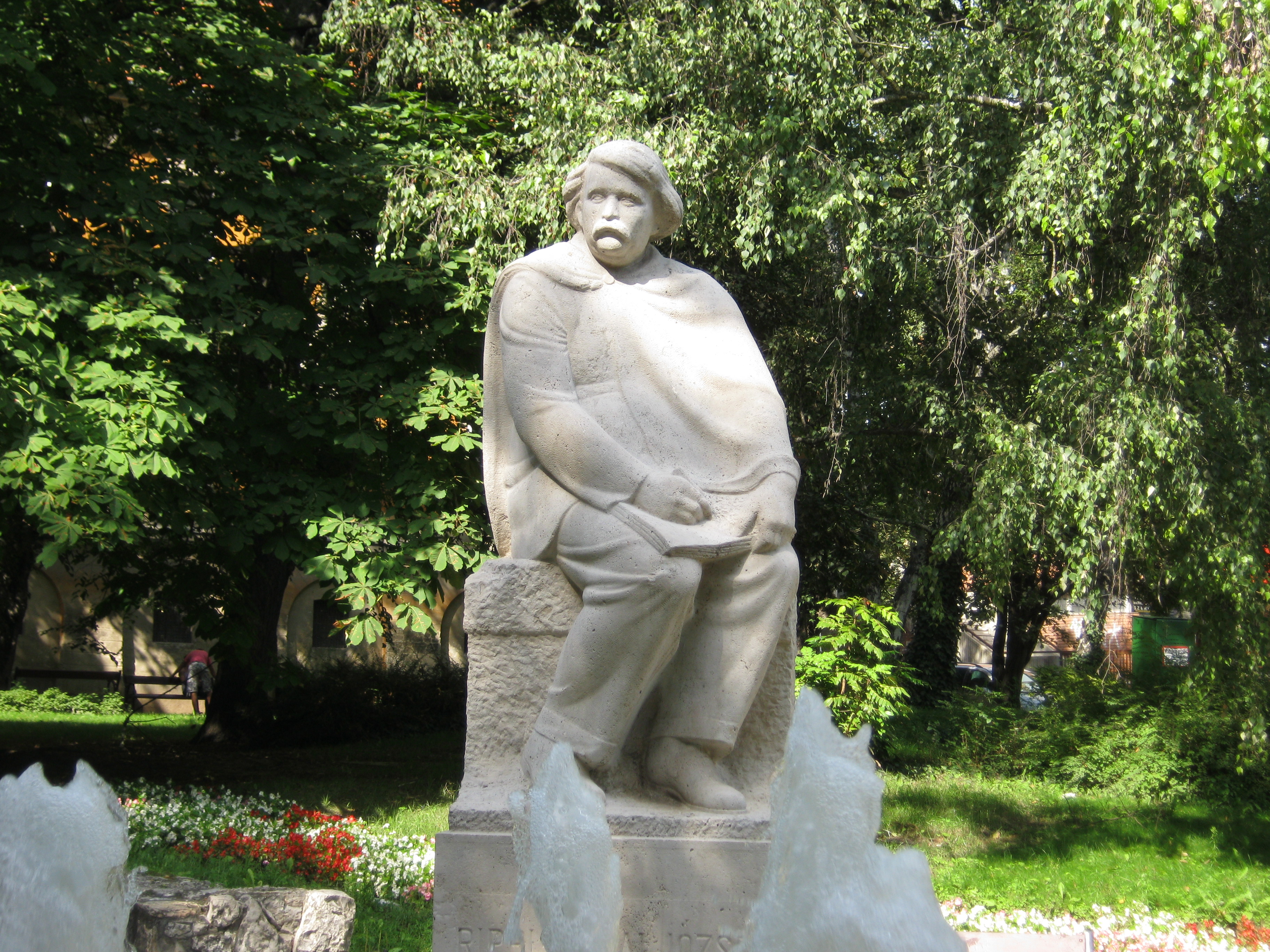 Nyilvános 961 | 1849 | Kaposvár, Rippl-Rónai tér: Rippl-Rónai József szobra | Medgyessy Ferenc 1930-ban készített szobrát 1950-ben állították fel a festőművészről elnevezett téren. A posztimpresszionista és szecessziós törekvések legkiemelkedőbb magyarországi képviselőjeként számon tartott Rippl-Rónai József eredetileg Kaposváron patikussegédnek tanult (lásd: Kaposvár, Fő u. 19.). Művészi munkássága Párizsban, Munkácsy Mihály tanítványaként bontakozott ki. 1902-ben visszatért Kaposvárra, az I. világháború kitörése azonban ismét Párizsban érte, ahol elfogták és internálták. 1915-ben ismét visszatért a szülővárosába, és haláláig a jelenleg múzeumként látogatókat fogadó Róma-villa (lásd: Kaposvár, Róma hegy) volt az otthona. A fénykép 2010 augusztusában készült. |