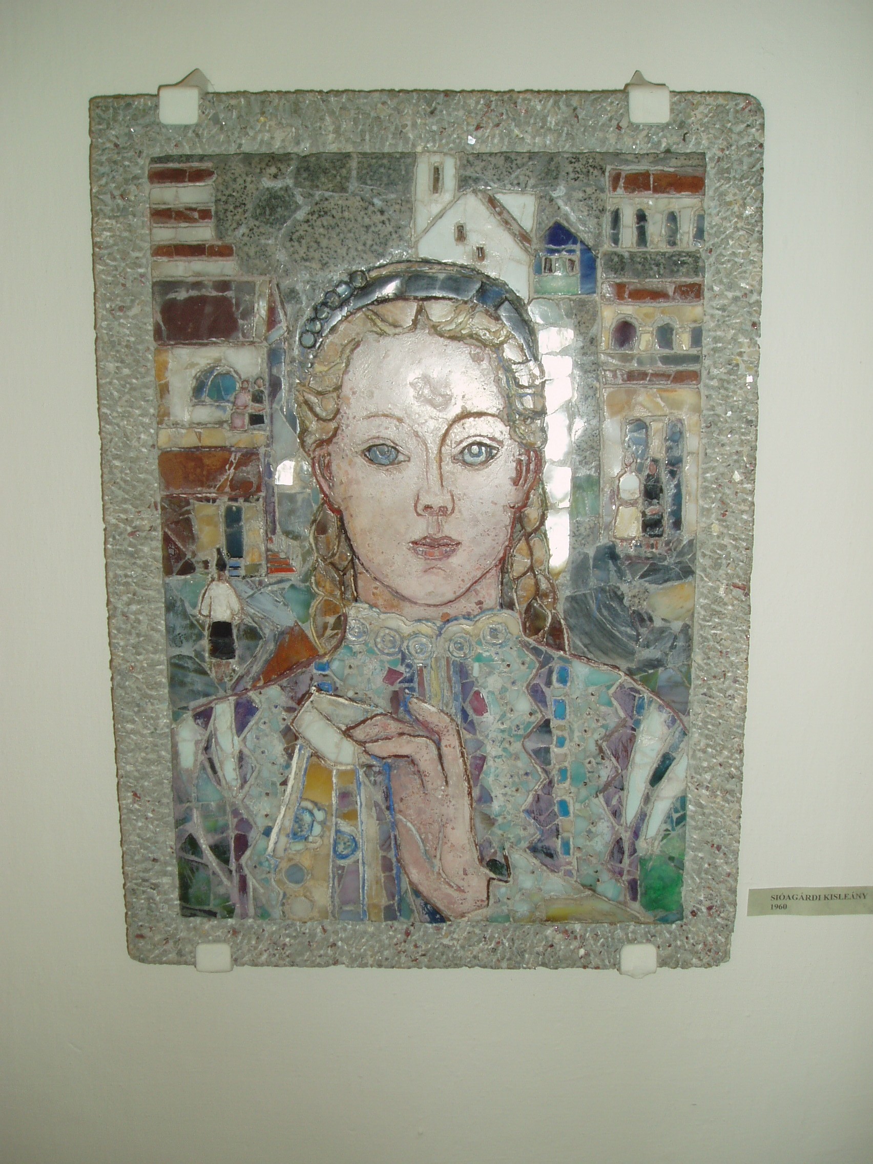 Nyilvános 992 | 1717 | Szekszárd, Béla tér 1. | A szekszárdi Megyeházán állandó kiállításon láthatók Mattioni Eszter (1902-1993) művei. A kiállítás anyagát azok a képek alapozták meg, amelyeket 1981-ben ajándékozott szülővárosának. Irodalomtörténeti érdekesség, hogy Mattioni Eszter nagymamája az a Sass Erzsike volt, akivel Petőfi csillagot választott a négyökrös szekéren... Az olasz származású Mattioni Eszter 1902-ben született Szekszárdon. Olasz édesapja selyemhernyótenyésztési szakembernek jött Magyarországra. Édesanyja Szekszárdon volt óvónő abban az óvodában, amelyet egykor Brunszvik Teréz alapított. Mattioni Eszter alkotta meg az általa hímeskőnek elnevezett technológiát, mely a klasszikus mozaik XX. századi változata: az egyformára vágott üveghasábok, kőzúzalékok helyett az ábra formáinak megfelelő, különböző méretű színes márványdarabokat, féldrágaköveket ágyaz cementbe. A képen egy ezzel a technológiával készült leányportréja látható. A fénykép 2006 júliusában készült. Felh. irod.: www.szekszard.hu Mattioni Eszter. Szekszárd, Wosinszky Mór Megyei Múzeum, 1990 |