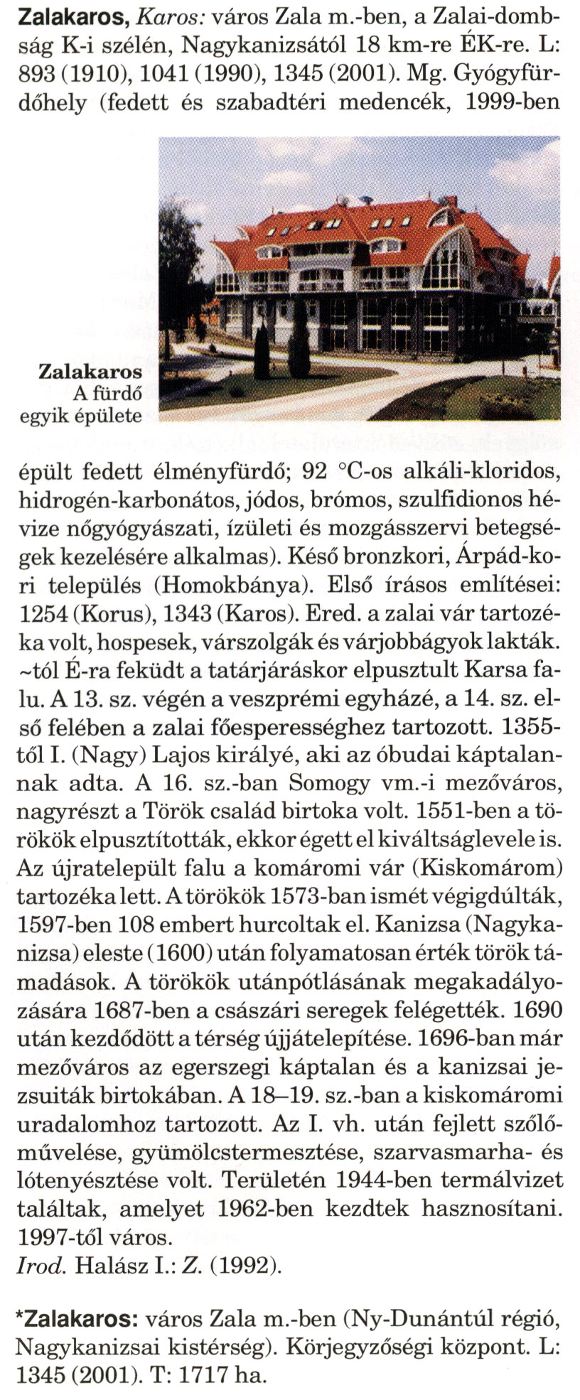 Nyilvános 1461 | 2960 | A szócikkek felismertetett szövege: | (A csillag után a kiegészítő kötetből származó szöveg következik) Zalakaros, Karos: város Zala m.-ben, a Zalai-dombság K-i szélén, Nagykanizsától 18 km-re ÉK-re. L: 893 (1910), 1041 (1990), 1345 (2001). Mg. Gyógyfür-dőhely (fedett és szabadtéri medencék, 1999-ben épült fedett élményfürdő; 92 °C-os alkáli-kloridos, hidrogén-karbonátos, jódos, brómos, szulfidionos hévize nőgyógyászati, ízületi és mozgásszervi betegségek kezelésére alkalmas). Késő bronzkori, Árpád-kori település (Homokbánya). Első írásos említései: 1254 (Korus), 1343 (Karos). Ered. a zalai vár tartozéka volt, hospesek, várszolgák és várjobbágyok lakták. ~tól É-ra feküdt a tatárjáráskor elpusztult Karsa falu. A 13. sz. végén a veszprémi egyházé, a 14. sz. első felében a zalai főesperességhez tartozott. 1355-től I. (Nagy) Lajos királyé, aki az óbudai káptalannak adta. A 16. sz.-ban Somogy vm.-i mezőváros, nagyrészt a Török család birtoka volt. 1551-ben a törökök elpusztították, ekkor égett el kiváltságlevele is. Az újratelepült falu a komáromi vár (Kiskomárom) tartozéka lett. A törökök 1573-ban ismét végigdúlták, 1597-ben 108 embert hurcoltak el. Kanizsa (Nagykanizsa) eleste (1600) után folyamatosan érték török támadások. A törökök utánpótlásának megakadályozására 1687-ben a császári seregek felégették. 1690 után kezdődött a térség újjátelepítése. 1696-ban már mezőváros az egerszegi káptalan és a kanizsai jezsuiták birtokában. A 18—19. sz.-ban a kiskomáromi uradalomhoz tartozott. Az I. vh. után fejlett szőlőművelése, gyümölcstermesztése, szarvasmarha- és lótenyésztése volt. Területén 1944-ben termálvizet találtak, amelyet 1962-ben kezdtek hasznosítani. 1997-től város. Irod. Halász I.: Z. (1992). *Zalakaros: város Zala m.-ben (Ny-Dunántúl régió, Nagykanizsai kistérség). Körjegyzőségi központ. L: 1345 (2001). T: 1717 ha. A szócikkek a következő lexikonból származnak: Cím: Magyar nagylexikon Közreműködő: Élesztős László (1949) (szerk.) ; Barabás Éva (1943) (szerk.) ; Berényi Gábor (1946) (szerk.) ; Bárány Lászlóné (szerk.) ; Adelmann-né Kertész Judit (1945) (közrem.) ; Froemel Károlyné Jáky Éva (1936) (közrem.) ; Akadémiai Kiadó és Nyomda Vállala Szerz. közl.: [... Élesztős László főszerk.] ; [szerk. Barabás Éva et al.] ; [bibliogr. Adelmanné Kertész Judit] ; [kész. az Akadémiai Kiadó Magyar Nagylexikon Szerkesztőségében] Kiadás: Budapest : Akad. K., 1993- Kötetei: 1. köt., A - Anc 2. köt., And - Bag 3. köt., Bah - Bij 4. köt., Bik - Bz 5. köt., C - Csem 6. köt., Csen - Ec 7. köt., Ed - Fe 8. köt., Ff - Gyep 9. köt., Gyer - Iq 10. köt., Ir - Kip 11. köt., Kir - Lem 12. köt., Len - Mep 13. köt., Mer - Nyk 14. köt., Nyl - Pom 15. köt., Pon - Sek 16. köt., Sel - Szö 17. köt., Szp - Ung 18. köt., Unh - Z 19. köt., Kiegészítő kötet, A - Z ETO jelzet: 030=945.11 Szakjelzet: 030 Cutter: M 14 ISBN: 963-05-6611-7 [!ISBN 963-05-6615-X] Nyelv: magyar Megjegyzés: Az 5. kötettől kiad. a Magyar Nagylexikon Kiadó ; A 6. kötettől főszerk. Berényi Gábor ; A 6. kötettől szakszerk. Bárány Lászlóné et al. ; A 6. kötettől bibliogr. Froemel Károlyné ; Bibliogr. a szócikkek végén |
