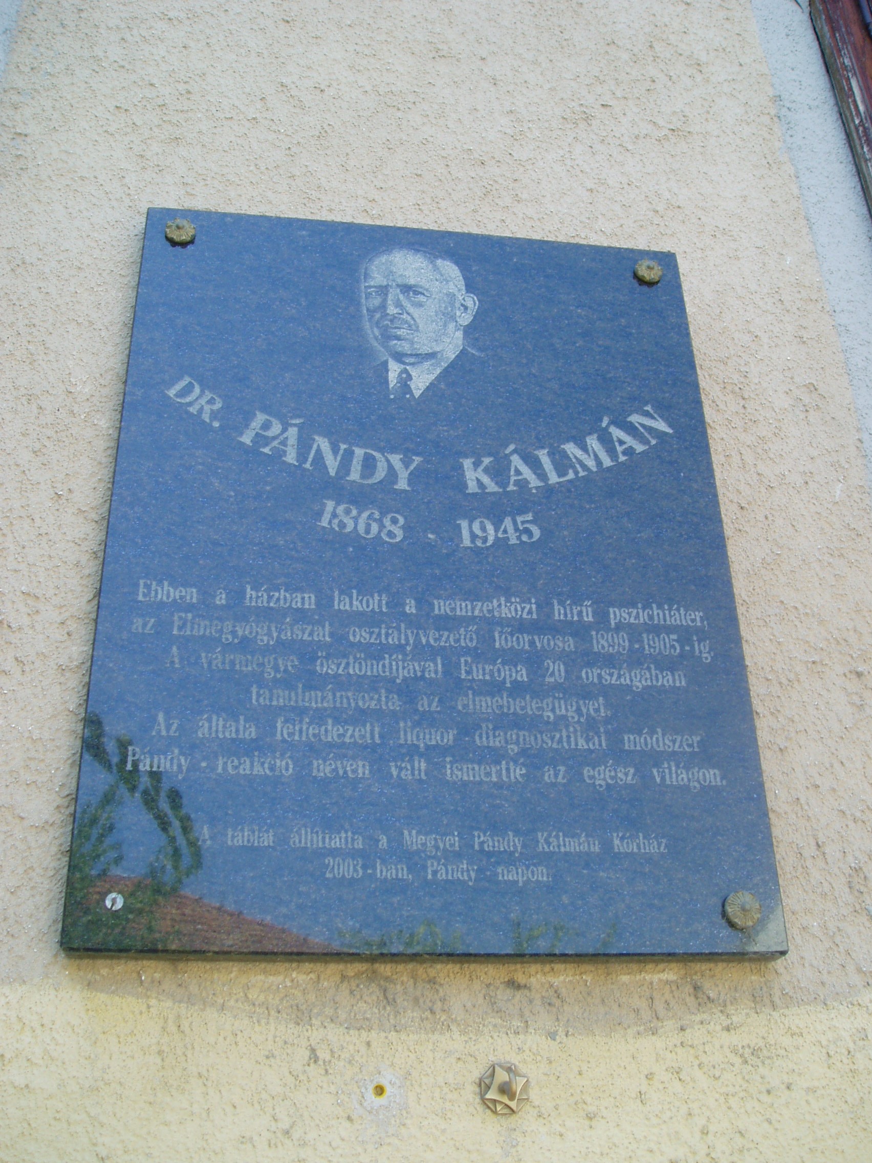 Nyilvános 920 | 1447 | Gyula, Munkácsy utca 5. | Mint az épületen elhelyezett emléktáblán is olvasható, 1899 és 1905 között ebben a házban élt Pándy Kálmán (1868-1945), a nemzetközi hírű pszichiáter. A fénykép 2007 júliusában készült. |