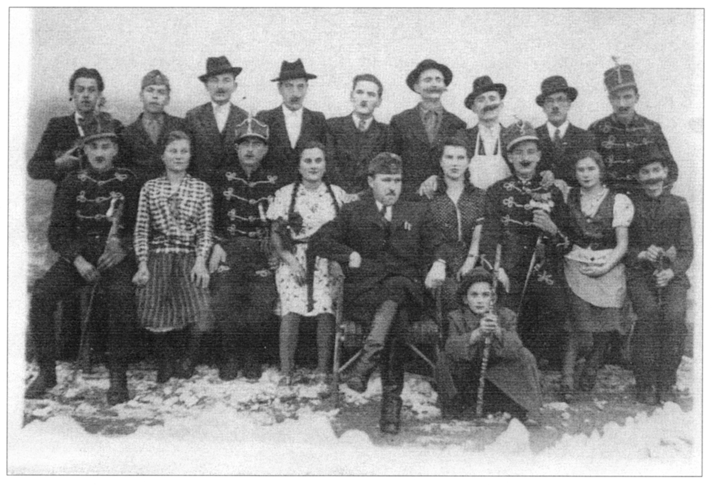 Nyilvános 1705 | 4979 | "A vén bakancsos... társulata" | Felső sor, balról: Horváth Rudolf, Révész István, Fleck József, Somogyi György, Pálmai László, Varga Lajos, Vajdai Károly, Dara József Alsó sor: Skoda Ferenc, Gyergyák Margit, Pusztai László, Gyergyák Anna, Vértes Imre, Vajdai Erzsébet, Somogyi Péter, Bedi Anna (Hajnalka), Sali László |