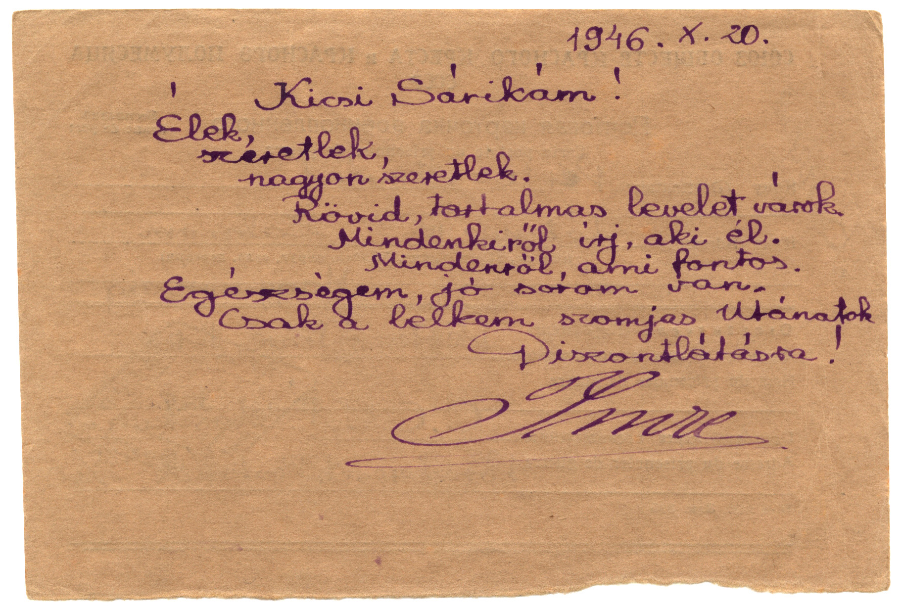 Nyilvános 1182 | 2274 | Vértes Imréné | Letenye IV. Zala vm. Magyarország Vértes Imre hdgy. C.C.C.P. Moszkva Vöröskereszt, Postafiók 430/1. c. 1946.X.20. Kicsi Sárikám! Élek, szeretlek, nagyon szeretlek. Rövid, tartalmas levelet várok. Mindenkiről írj, aki él. Mindenről, ami fontos. Egészségem, jó sorom van. Csak a lelkem szomjas utánatok. Viszontlátásra! Imre |