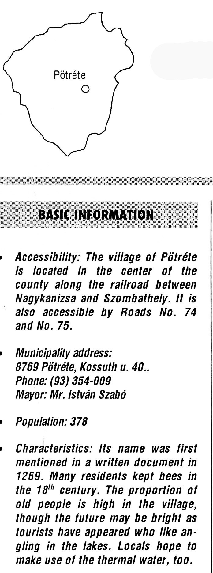 Nyilvános 2123 | 5488 | Pötréte | BASIC INFORMATION Accessibility: The village of Pötréte is located in the center of the county along the railroad between Nagykanizsa and Szombathely. It is also accessible by Roads No. 74 and No. 75. Municipality address: 8769 Pötréte, Kossuth u. 40. Phone: (93) 354-009 Mayor: Mr. István Szabó Population: 378 Characteristics: Its name was first mentioned in a written document in 1269. Many residents kept bees in the 18th century. The proportion of old people is high in the village, though the future may be bright as tourists have appeared who like angling in the lakes. Locals hope to make use of the thermal water, too. This text came from the following book: Title: Handbook of Zala county (Zala megye kézikönyve) Series: County handbooks of Hungary (Magyarország megyei kézikönyvei) Chief editor: Hóbor József Publisher: (Hatvan), CEBA-Hungary Ltd, 1998 ETO: 908.439.121(035) ; 050.8(439.121) ISBN: 963-9089-18-2 Pages: 488-1040 p. Remark: Closed on: 1998. márc. 31. |
