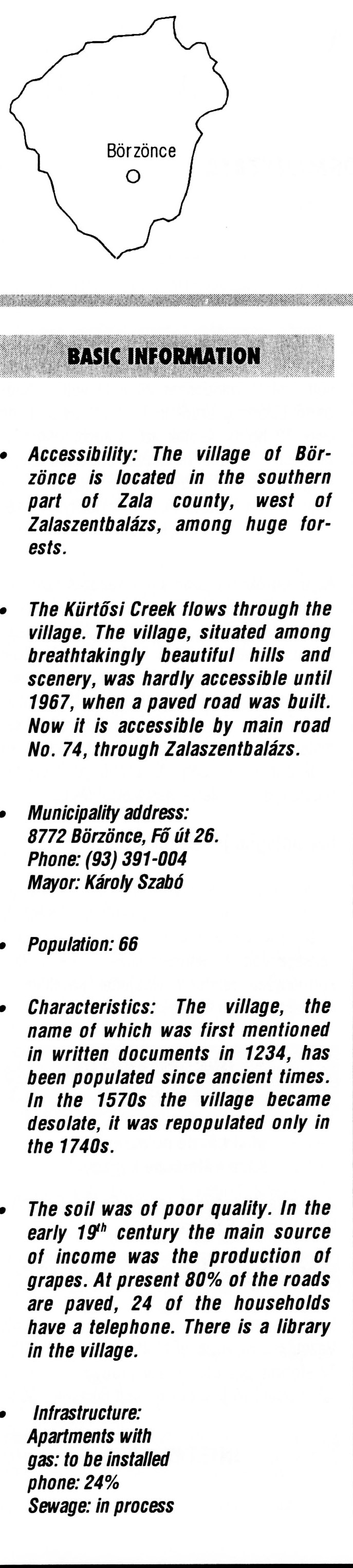 Nyilvános 2101 | 5842 | Börzönce | BASIC INFORMATION Accessibility: The village of Börzönce is located in the southern part of Zala county, west of Zalaszentbalázs, among huge forests. The Kürtősi Creek flows through the village. The village, situated among breathtakingly beautiful hills and scenery, was hardly accessible until 1967, when a paved road was built. Now it is accessible by main road No. 74, through Zalaszentbalázs. Municipality address: 8772 Börzönce, Fő út 26. Phone: (93) 391-004 Mayor: Károly Szabó Population: 66 Characteristics: The village, the name of which was first mentioned in written documents in 1234, has been populated since ancient times. In the 1570s the village became desolate, it was repopulated only in the 1740s. The soil was of poor quality. In the early 19th century the main source of income was the production of grapes. At present 80% of the roads are paved, 24 of the households have a telephone. There is a library in the village. Infrastructure: Apartments with gas: to be installed phone: 24% Sewage: in process This text came from the following book: Title: Handbook of Zala county (Zala megye kézikönyve) Series: County handbooks of Hungary (Magyarország megyei kézikönyvei) Chief editor: Hóbor József Publisher: (Hatvan), CEBA-Hungary Ltd, 1998 ETO: 908.439.121(035) ; 050.8(439.121) ISBN: 963-9089-18-2 Pages: 488-1040 p. Remark: Closed on: 1998. márc. 31. |